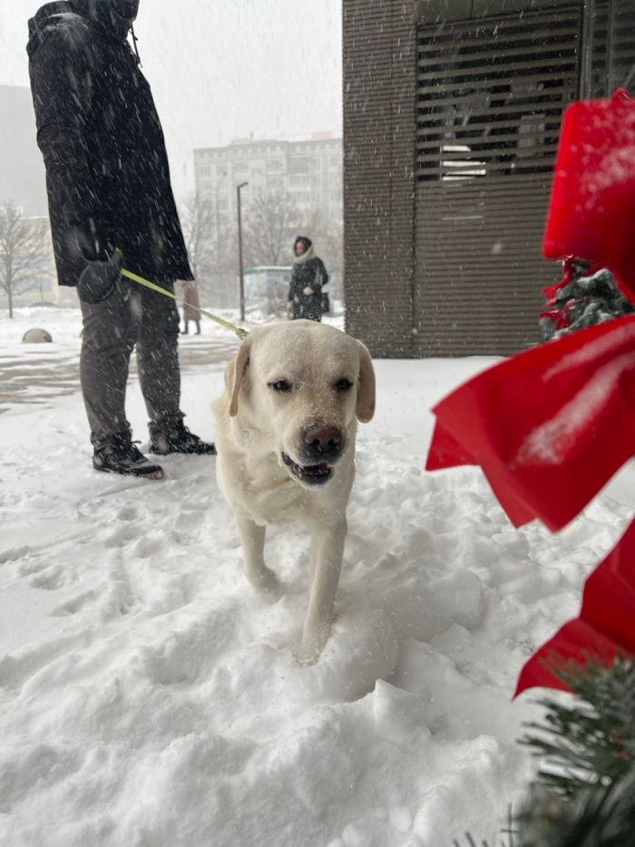 A yellow Labrador dog stands in deep snow, gazing upward. The dog is on a yellow leash held by a person wearing a black coat and grey pants. The scene is a winter snowstorm, with flakes visible. A red…read more