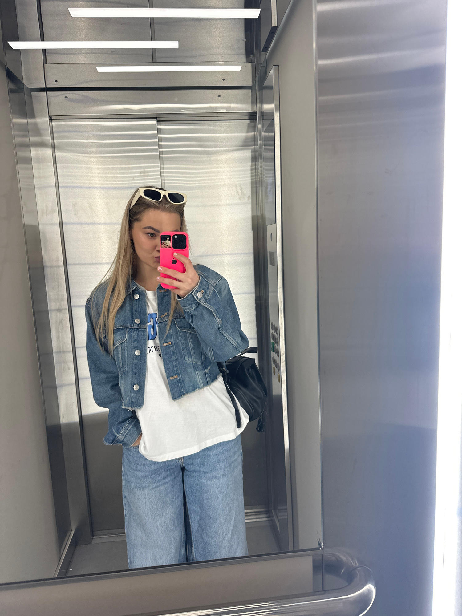 A young, blonde woman is taking a selfie in an elevator. She is wearing sunglasses, a white T-shirt, a denim jacket, and blue jeans. She holds a pink phone to take the picture. The elevator has a meta…read more