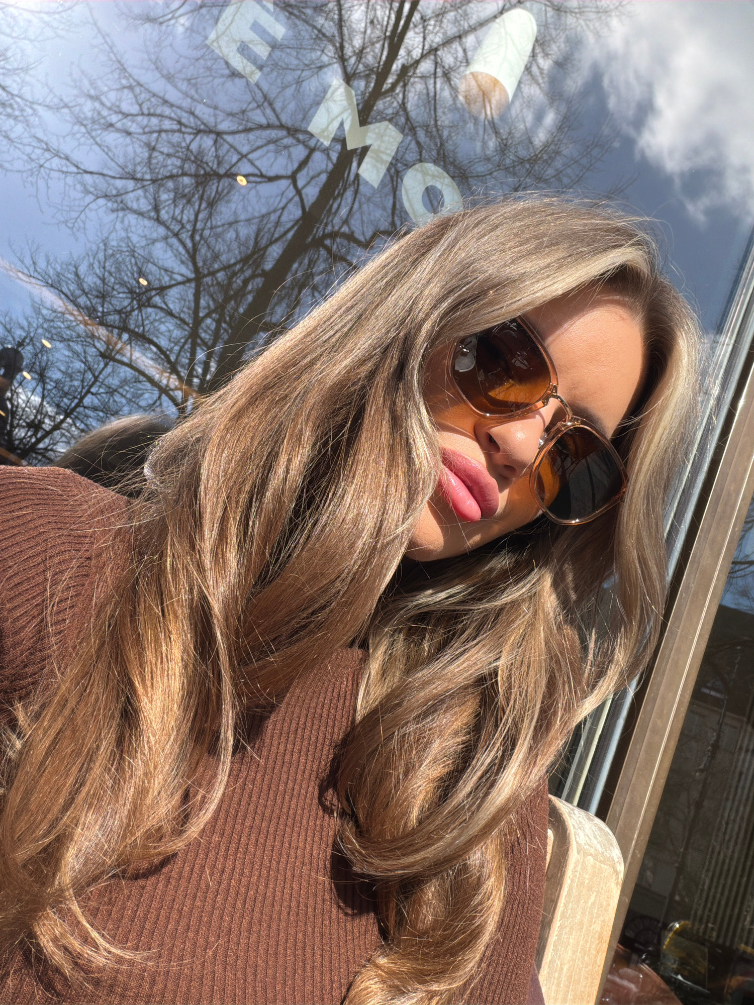 The image is an eye-level selfie of a light-skinned woman with long, blonde hair, sunglasses, and brown sweater, possibly taken at an outdoor café in Berlin, Germany. The woman is situated in front of…read more
