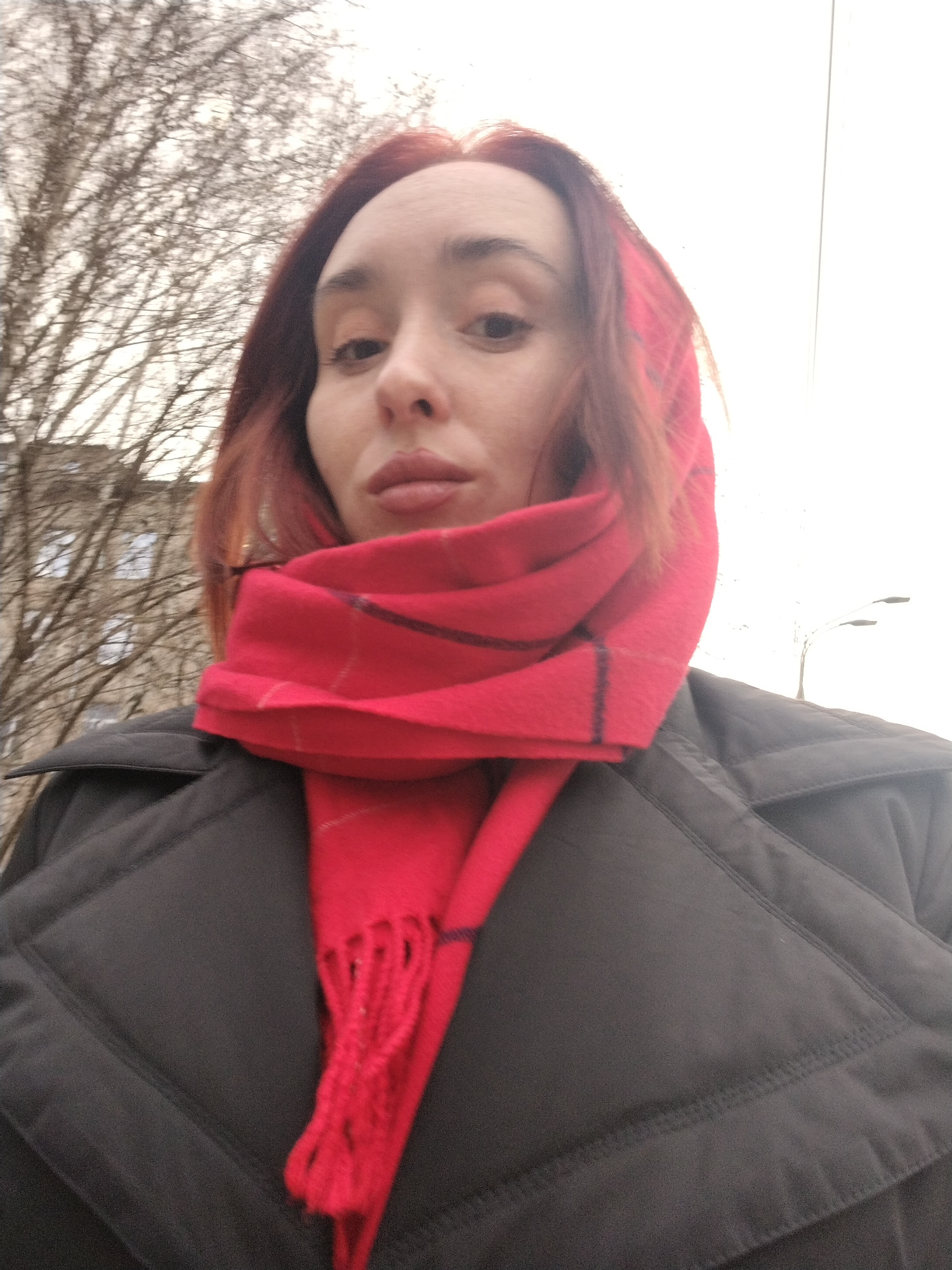 A medium close-up shot depicts a woman wearing a red plaid scarf draped over her head and shoulders, and a dark, quilted jacket. The scarf is bright red with dark plaid lines and a fringed edge. The jā¦read more