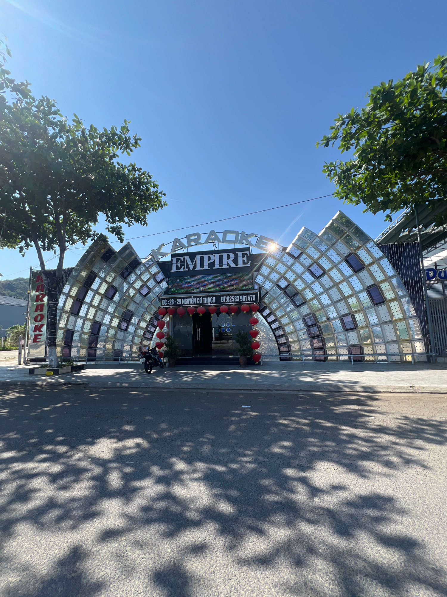 The image displays the exterior of the "KARAOKE EMPIRE" establishment, located at 28-29 Nguyễn Cơ Thạch street in Nha Trang, Vietnam. The building's prominent facade features a large, arched structure…read more