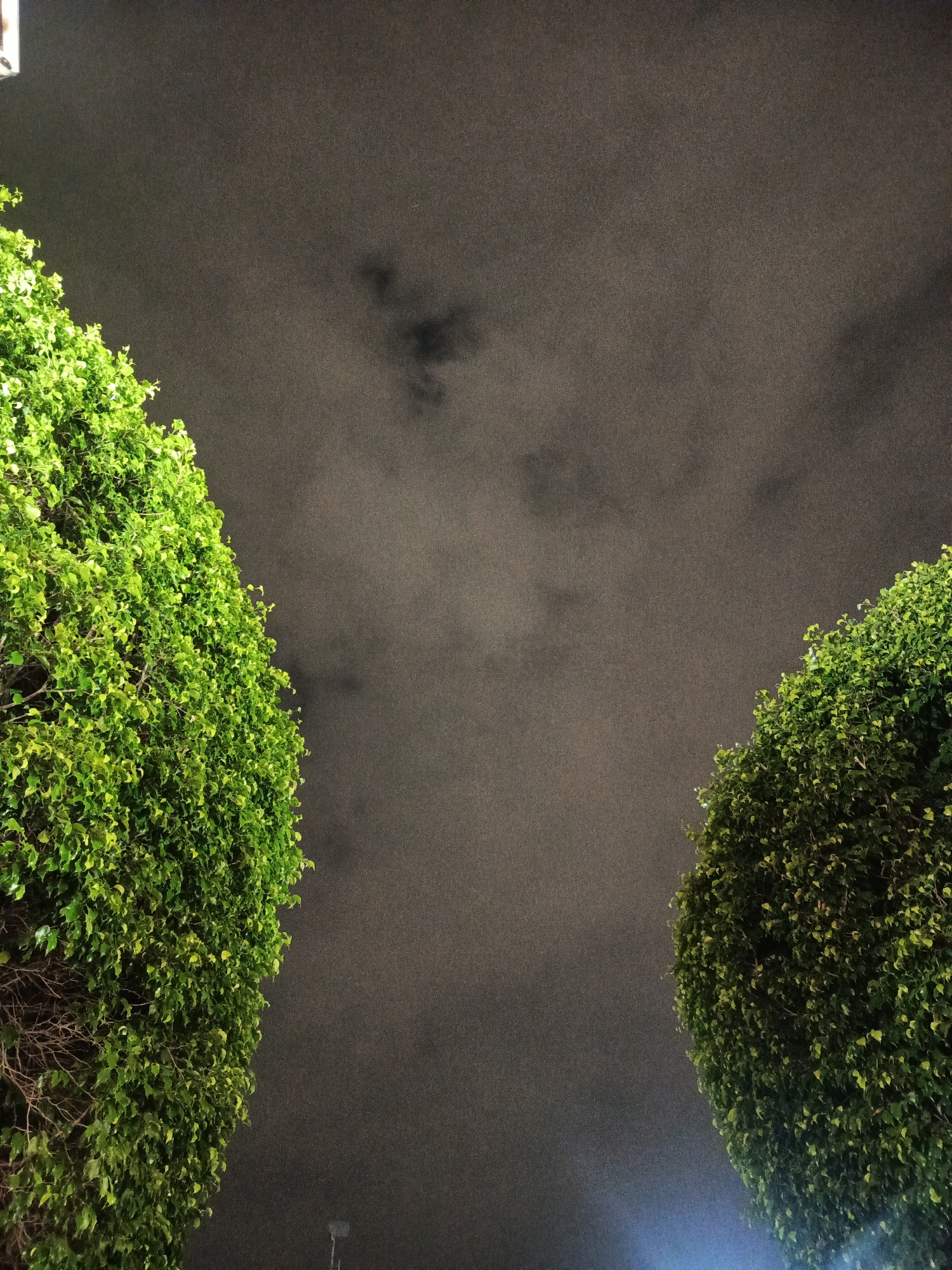 The image shows two lush green trees flanking a dark, cloudy night sky. It is likely that the trees are located somewhere in the city of Guayaquil, Ecuador. The trees are full and well-maintained, sug…read more