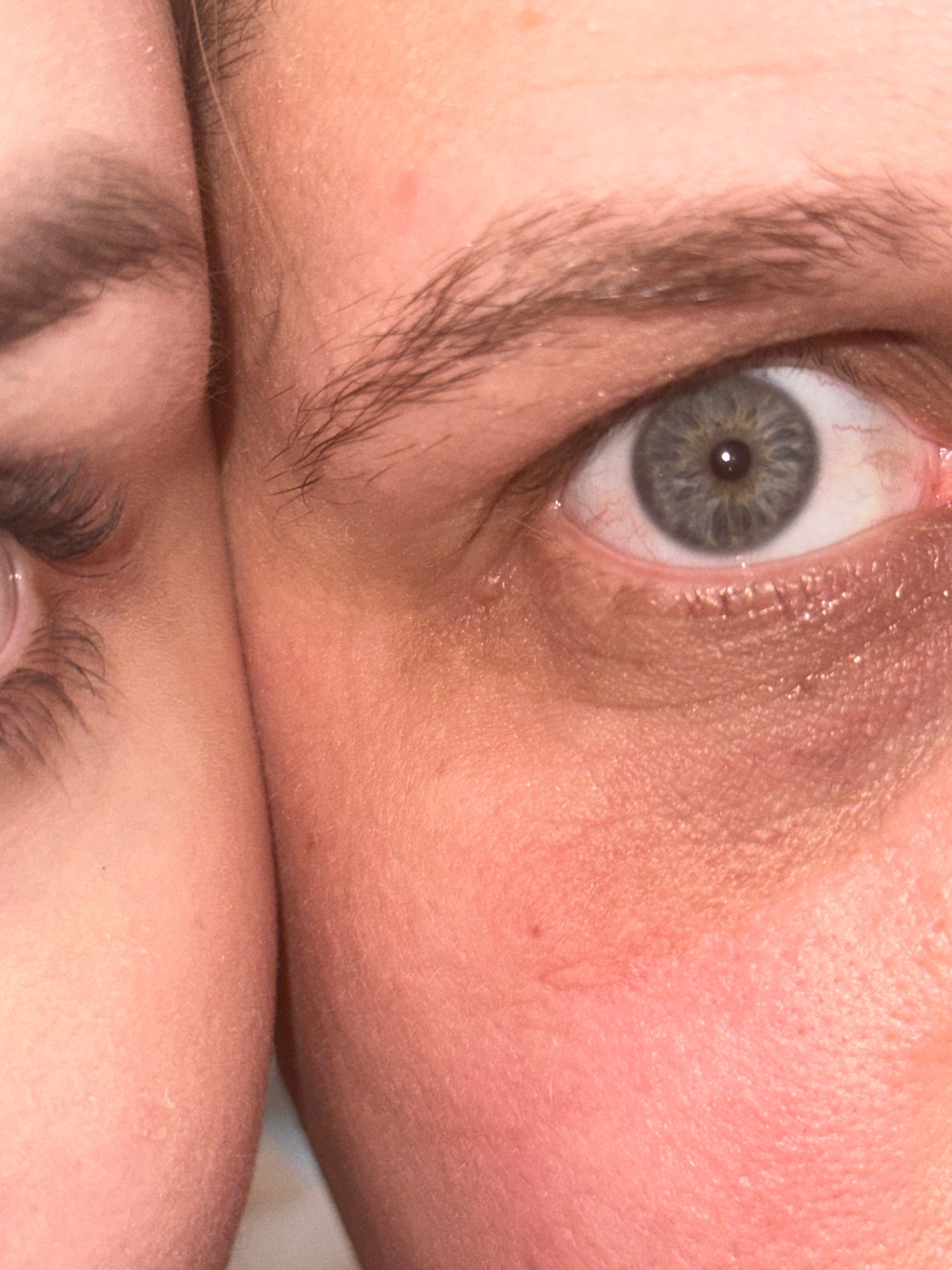 The image shows a close-up of a person's eye, with another person's face partially visible below. The eye is grey-blue with a dark pupil and visible blood vessels. Skin texture and eyebrow details are…read more