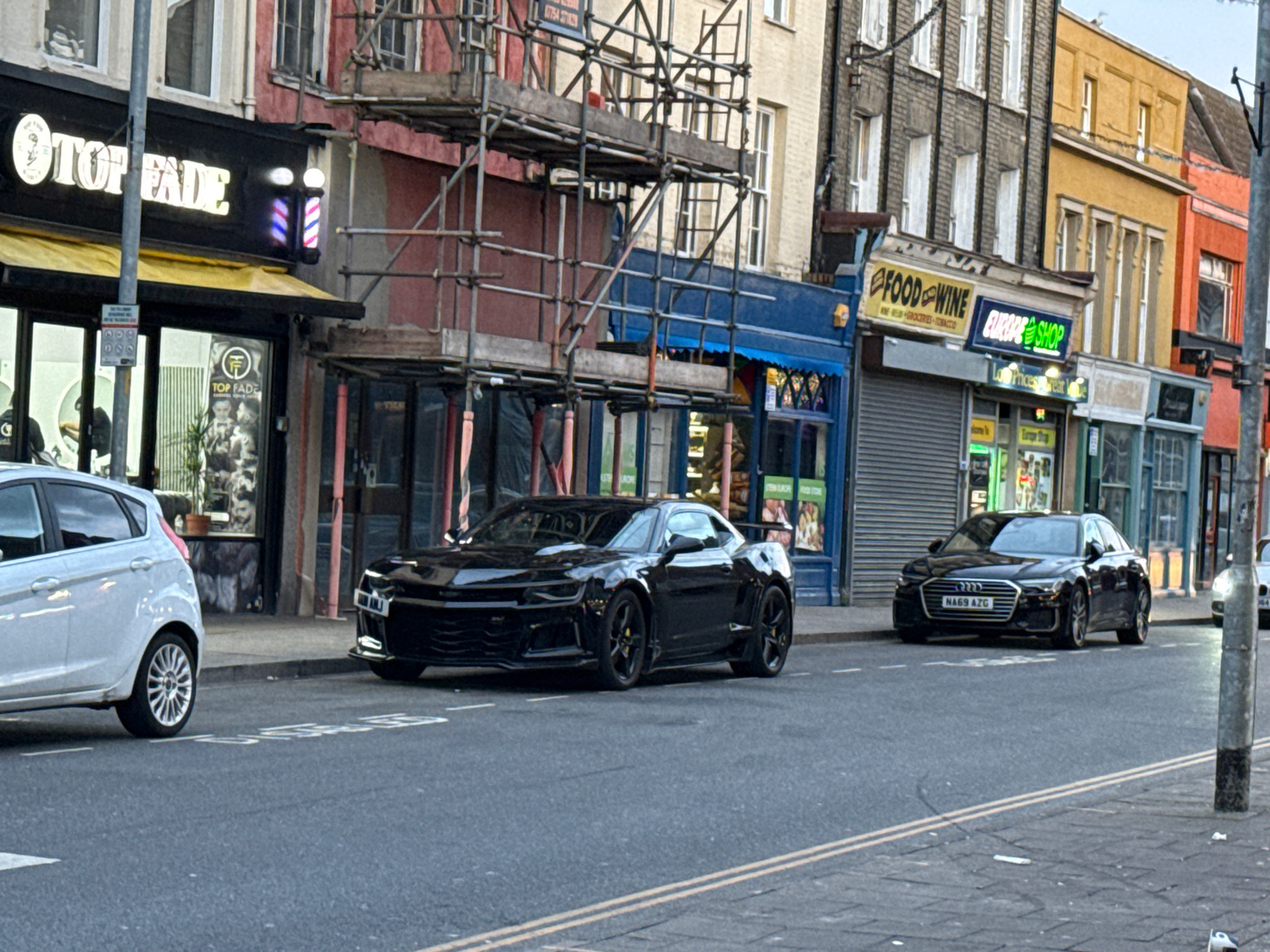 The image depicts a street scene in Great Yarmouth, United Kingdom. A white car is parked on the left of the frame, partially obscured. Next to it is a black Chevrolet Camaro. Further down the street,…read more