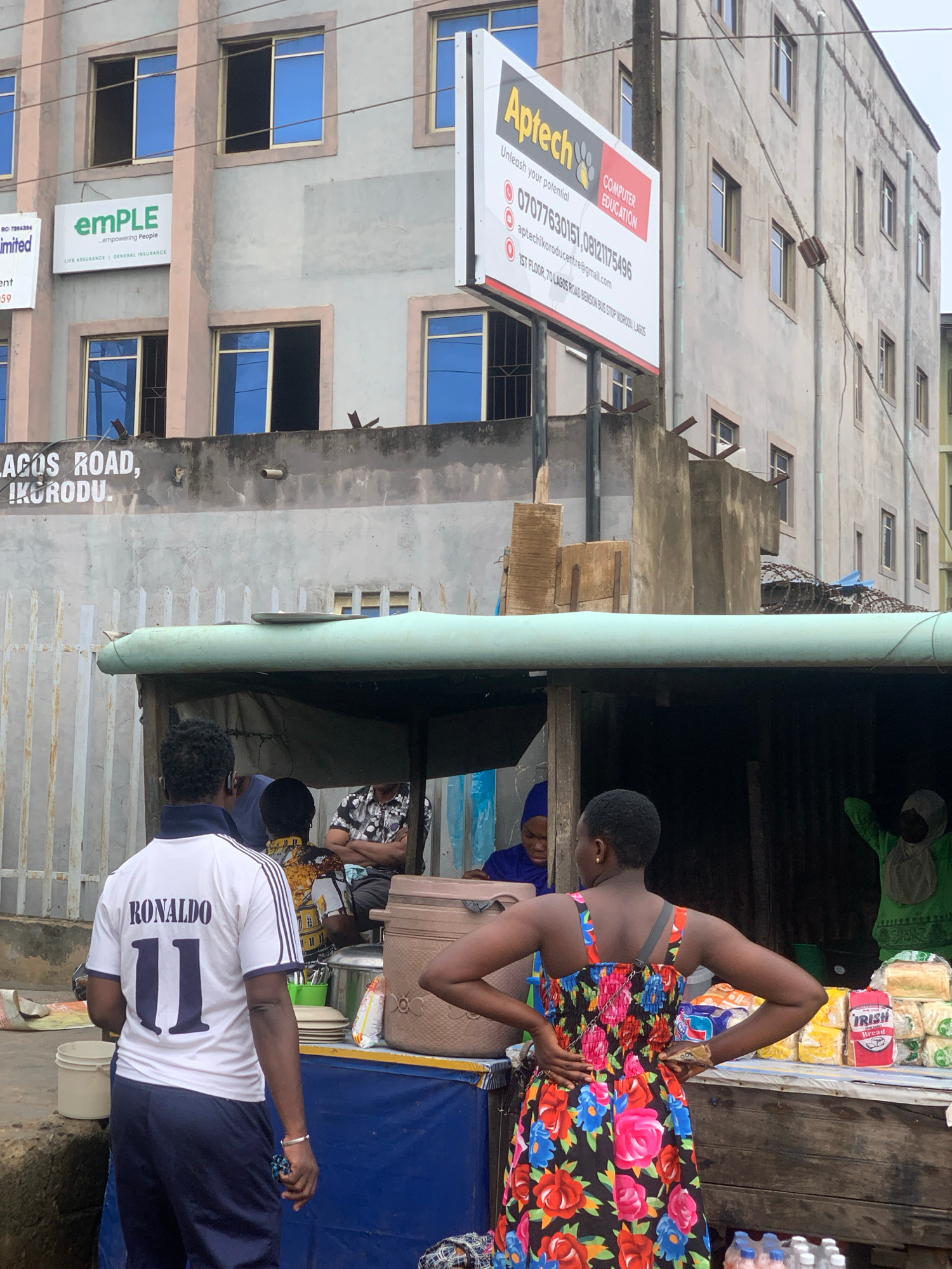 The image captures a street scene in Ikorodu, Nigeria. A building with blue-tinted windows and signs for "emPLE" (Life Assurance, General Insurance) and "Aptech" (Computer Education) is visible. The sā¦read more