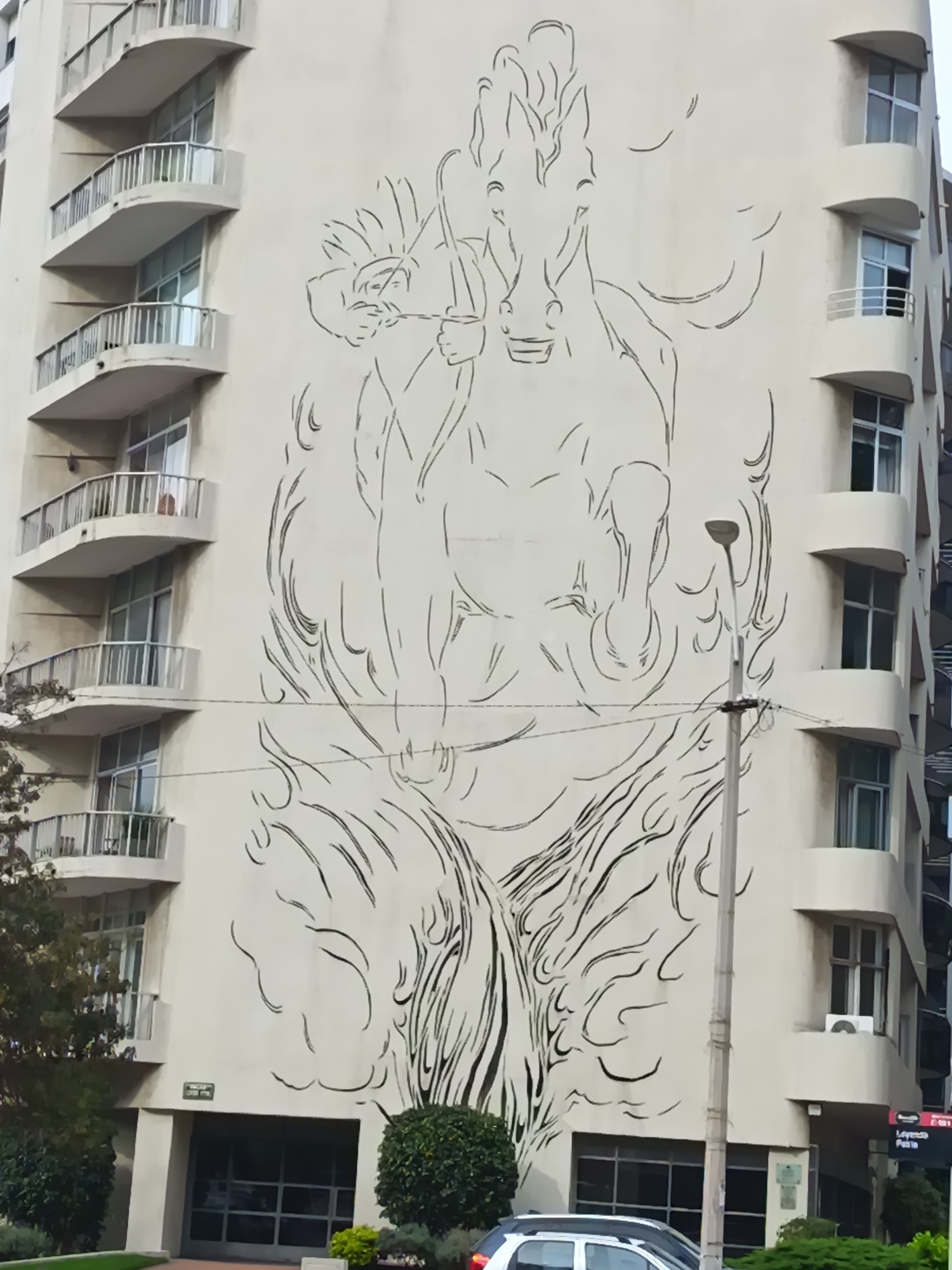 The image shows a tall building in Montevideo, Uruguay. On the building's facade is a large mural depicting a stylized image of a rider on horseback, possibly an archer. The building has multiple stor…read more