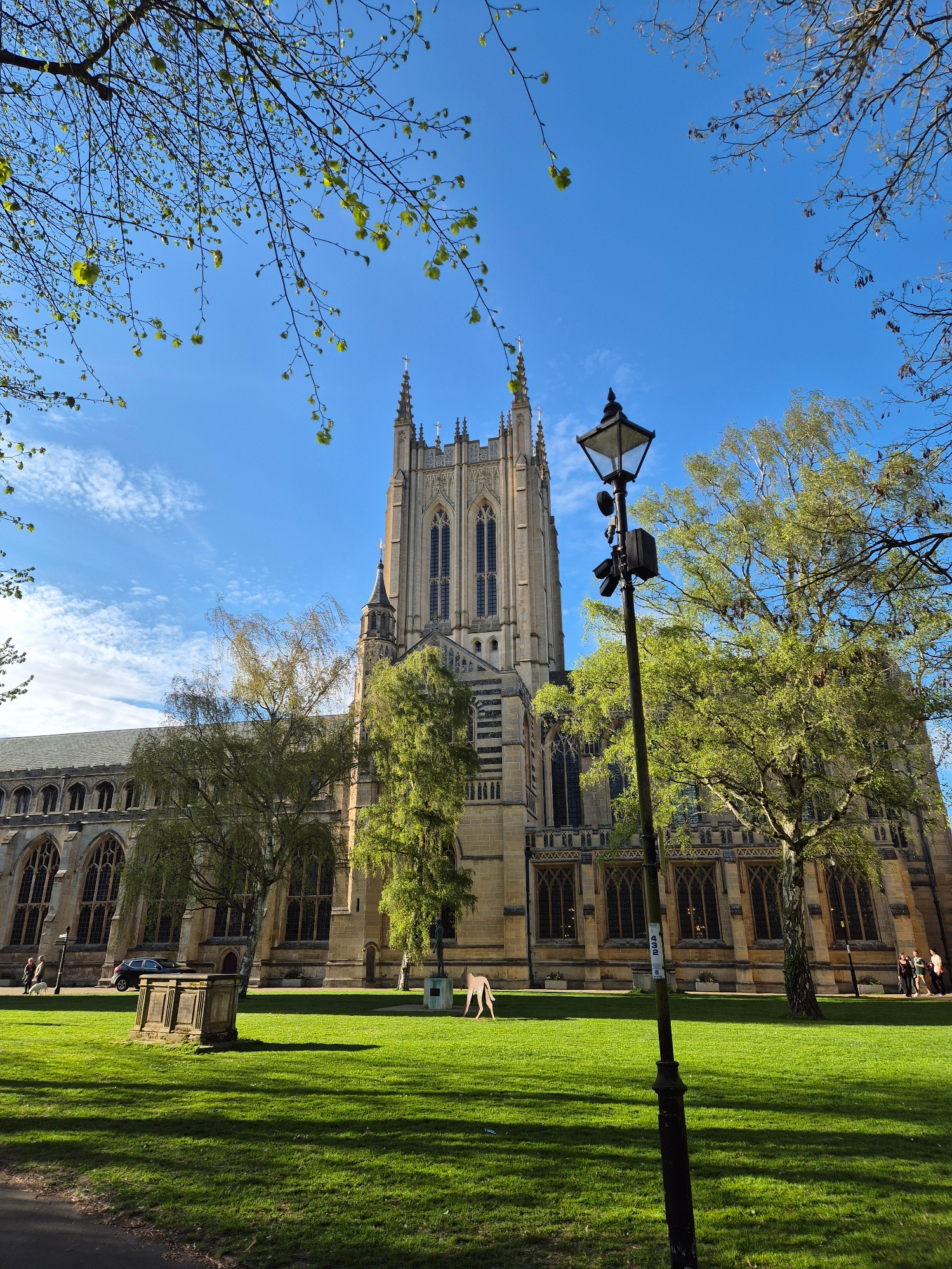 The image shows a tall, ornate cathedral in Bury St Edmunds, West Suffolk, United Kingdom, viewed from a low angle. The cathedral is made of light-colored stone and features multiple pointed spires, a…read more