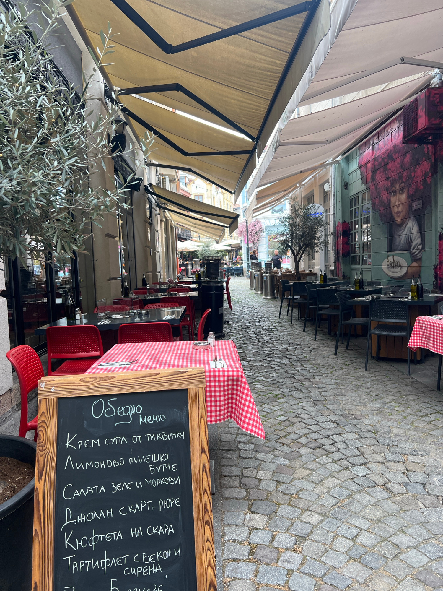 The image shows an outdoor dining area along a narrow street in what is likely the city of Plovdiv, Bulgaria. The view is from the street looking down a line of restaurants. The street is paved with l…read more