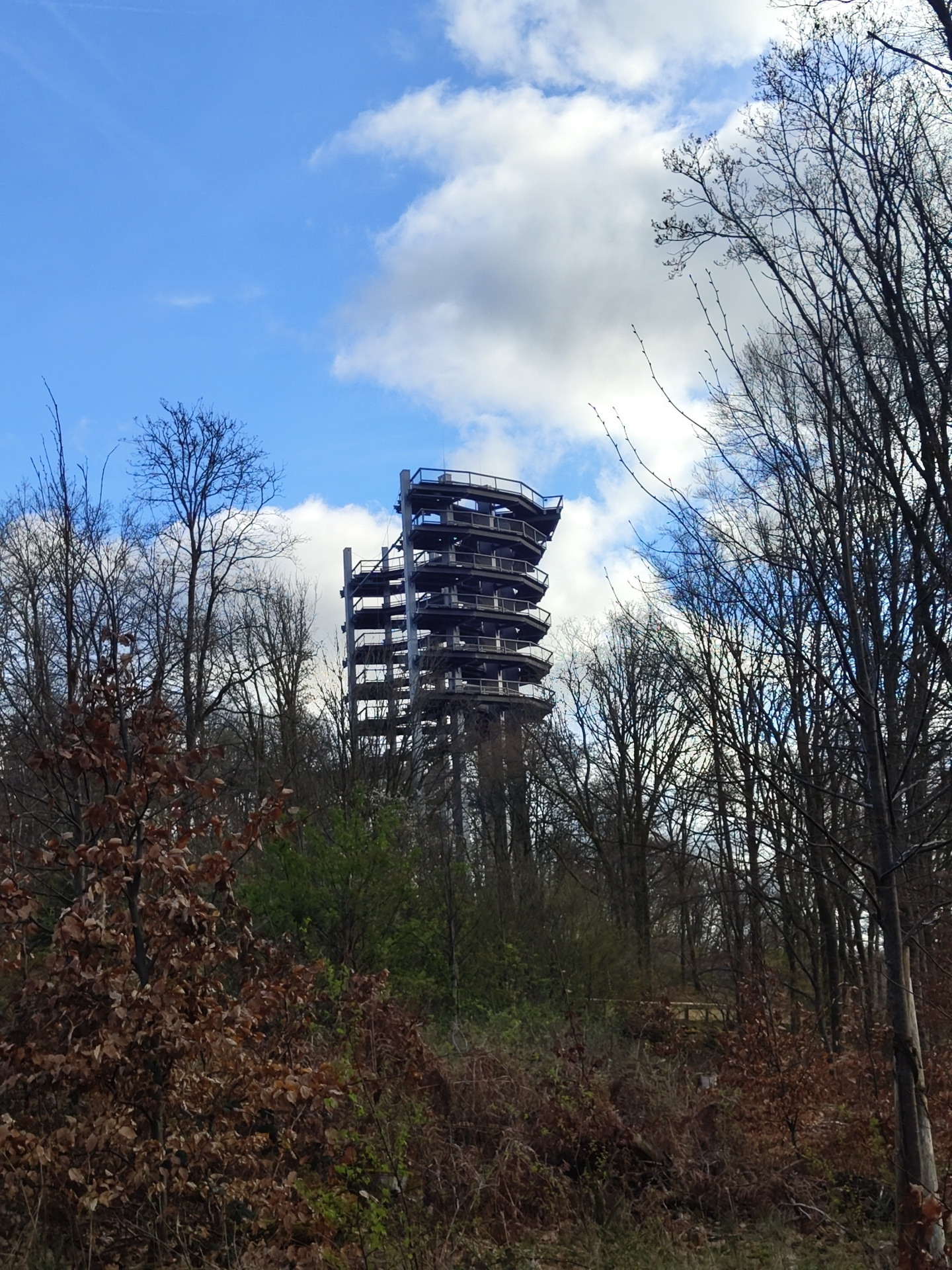 The image shows the "Baumwipfelpfad Saarschleife", a treetop walkway observation tower located in Mettlach, Germany. The multi-tiered, structural steel tower stands amongst bare trees in late autumn o…read more