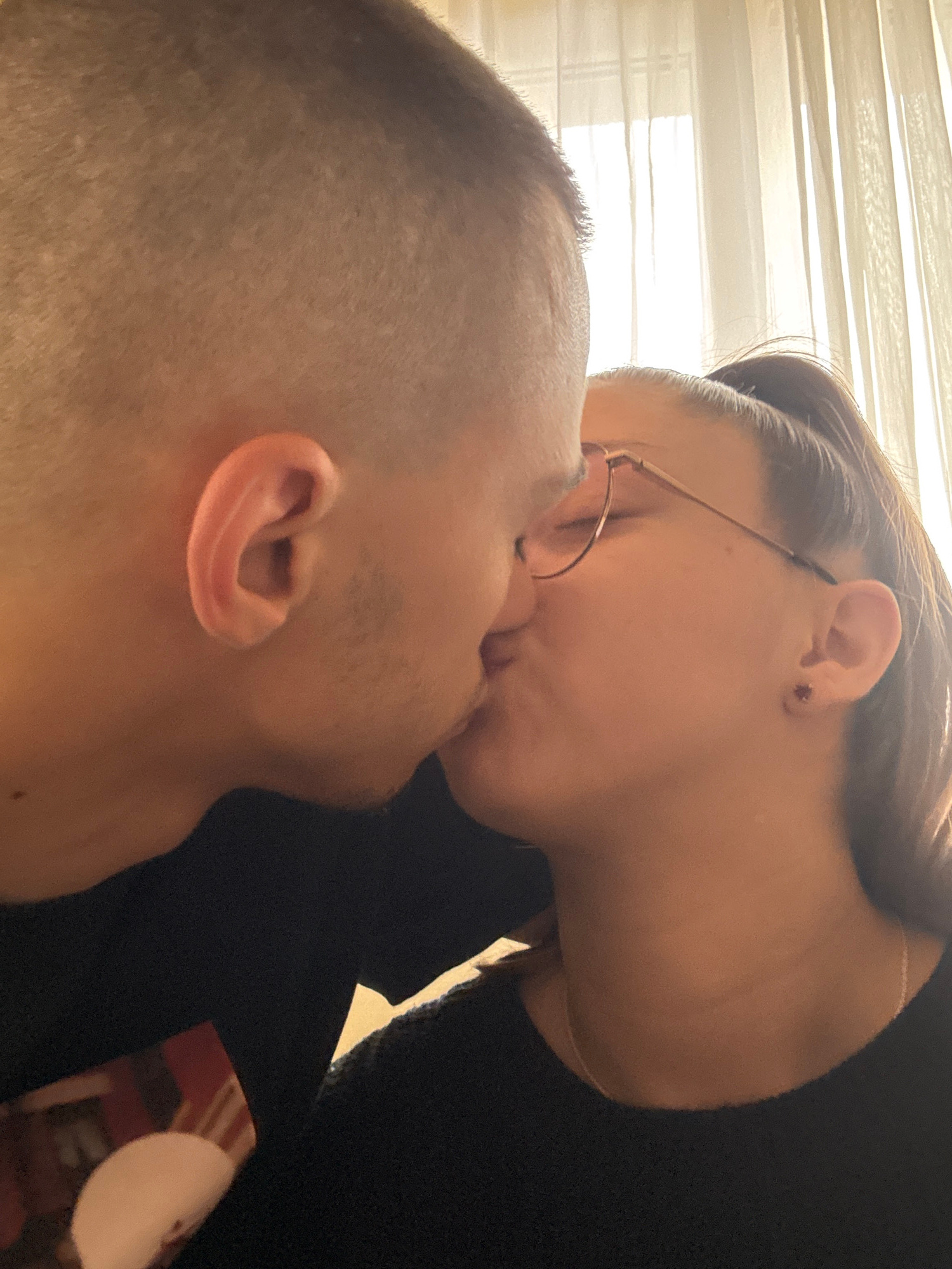 A photograph depicts two individuals kissing. The person on the right wears glasses and a black top, with brown hair. The person on the left has a shaved head. The background shows vertical blinds. It…read more