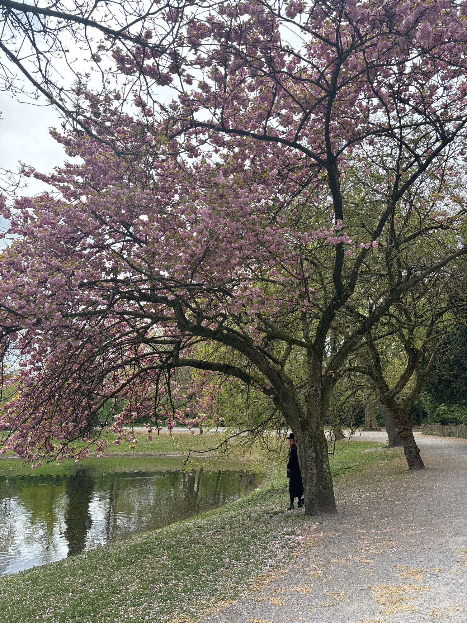 The image depicts a tree with pink blossoms in Antwerp, Belgium. A canal separates the viewer from a grassy bank where an individual dressed in dark clothing is standing, positioned by the tree trunk.…read more