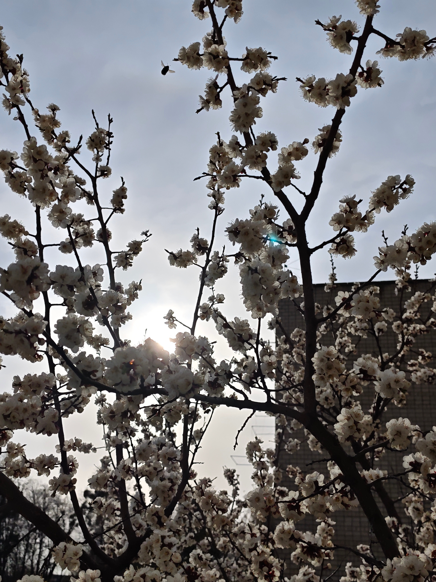 The image shows blooming trees with white flowers against a bright sky. The sun is visible through the branches, creating lens flare. A building is partially visible behind the trees. A flying insect,…read more