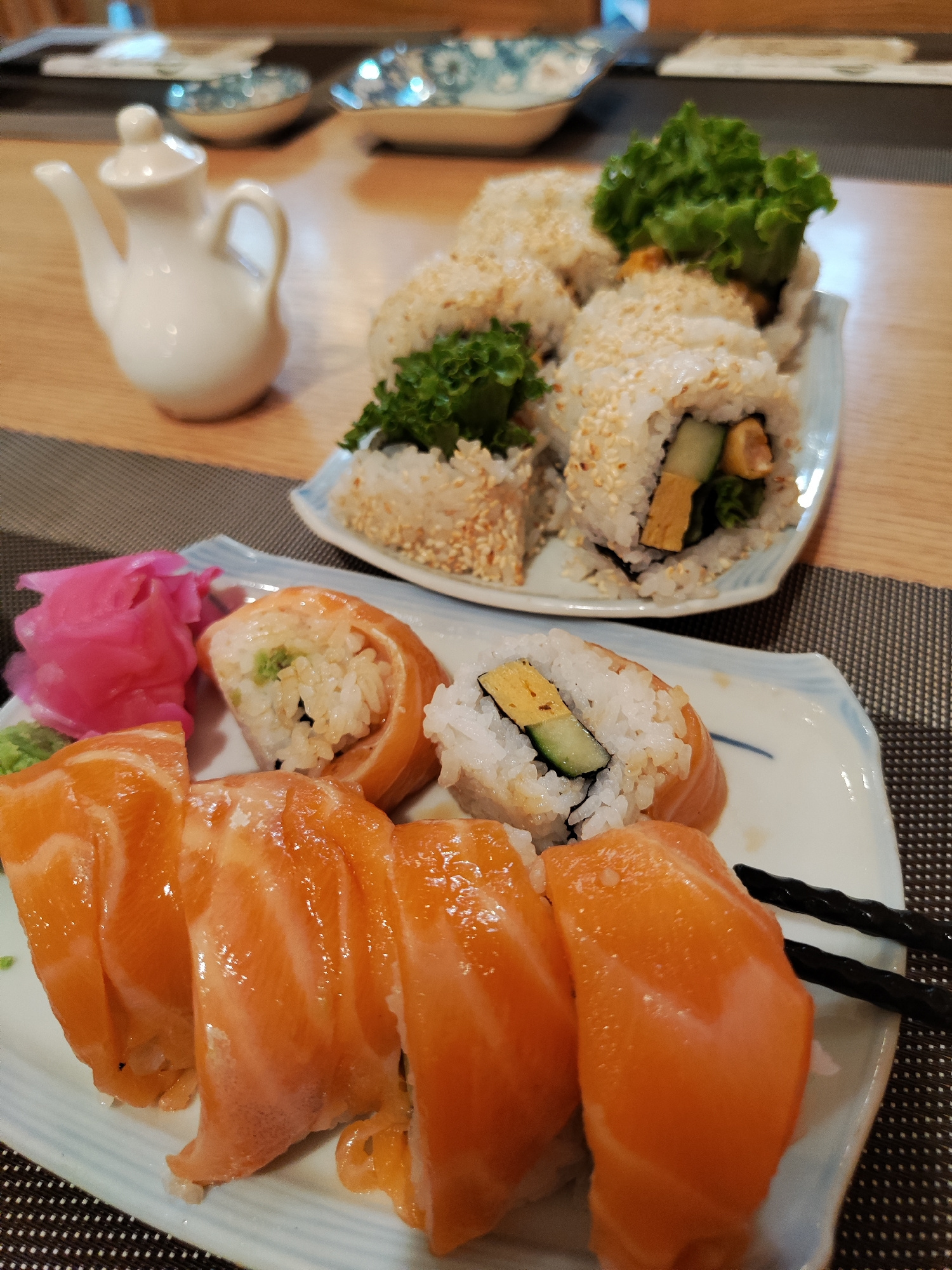 The image shows two plates of sushi on a wooden table with a placemat. The closer plate contains salmon sushi, along with pickled ginger, wasabi, and black chopsticks. The second plate holds sesame se…read more