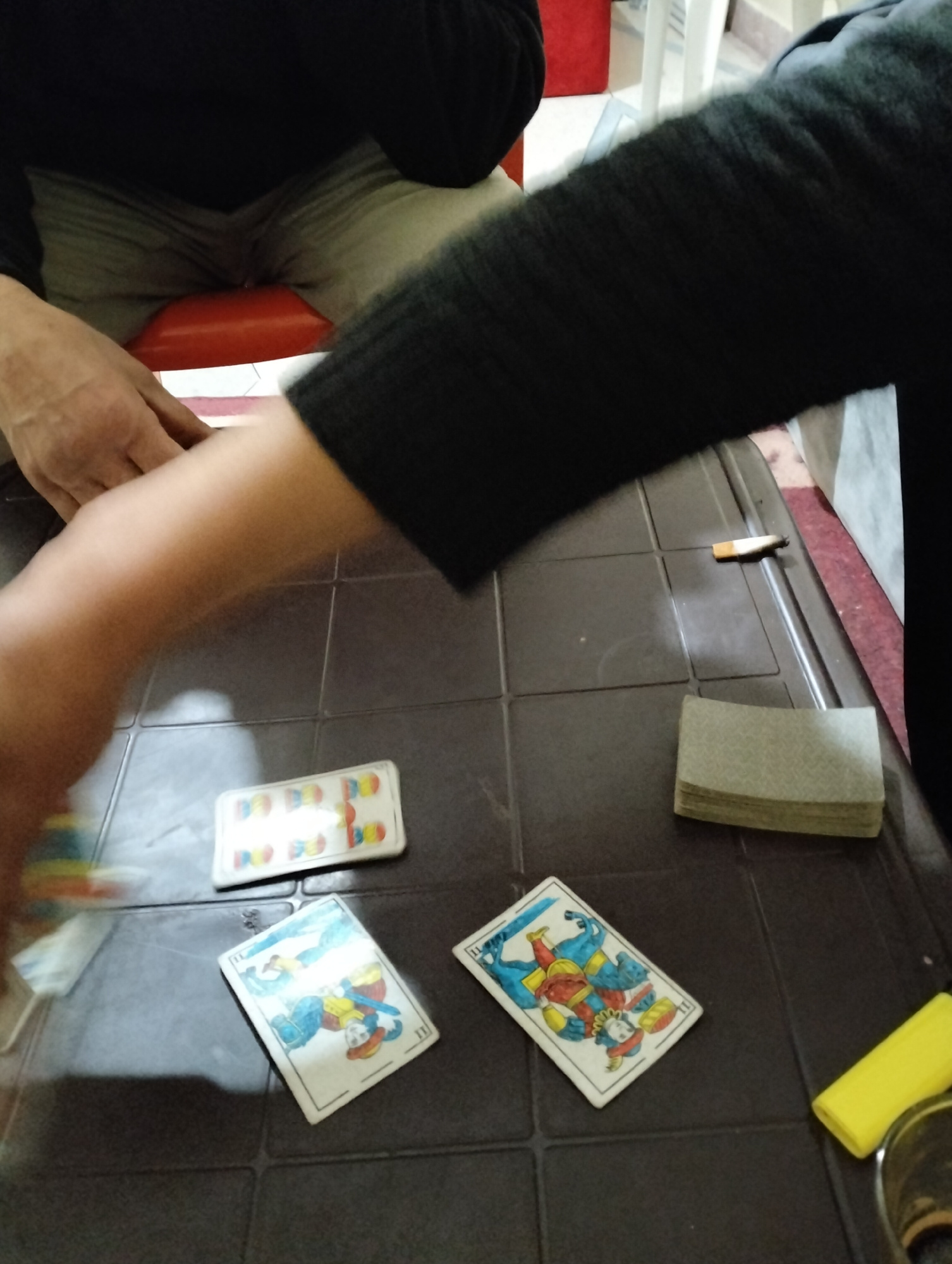 A low-angle, indoor shot shows a game of cards being played on a dark, possibly plastic or melamine table. Two people are partially visible; one is seated, wearing khaki pants and a dark long-sleeved…read more