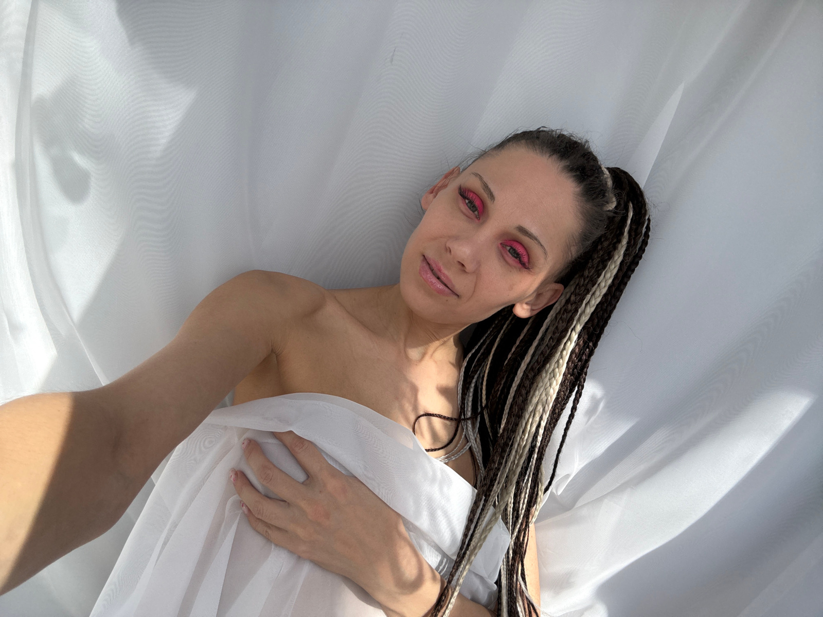 A woman lies supine on a white fabric backdrop, possibly a sheet or draped material. She has long, braided hair that is a mix of brown, black, and blonde strands. The woman's eyes appear red, possibly…read more