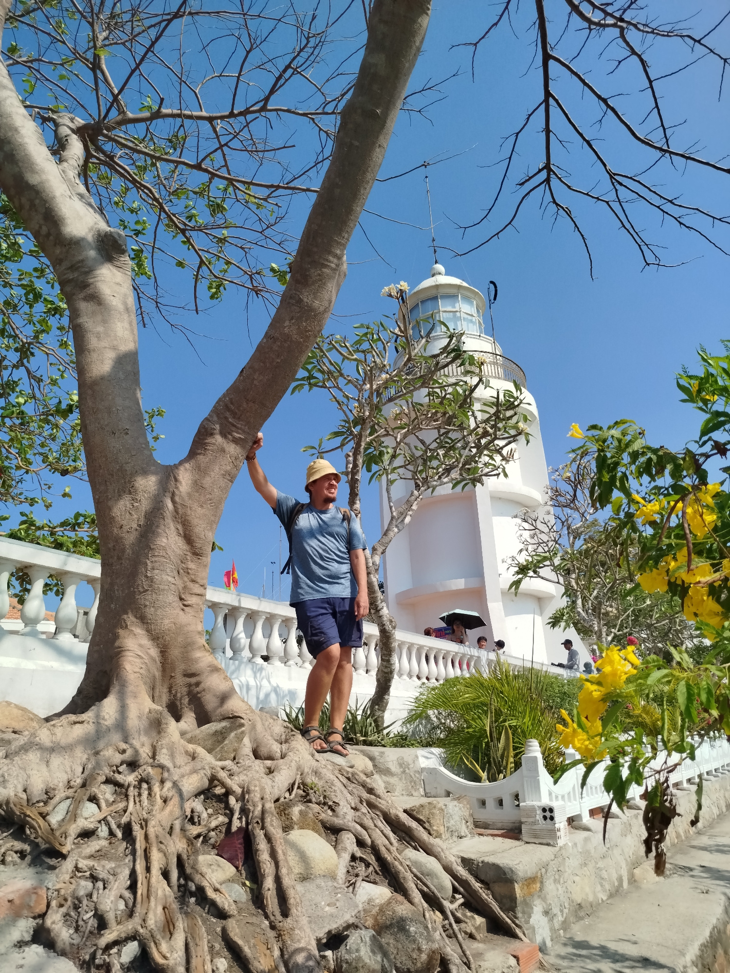 A medium shot captures a man standing next to a tree, with a lighthouse visible in the background. The man, wearing a blue t-shirt, blue shorts, sandals, and a straw hat, has a backpack and is holdingβ¦read more