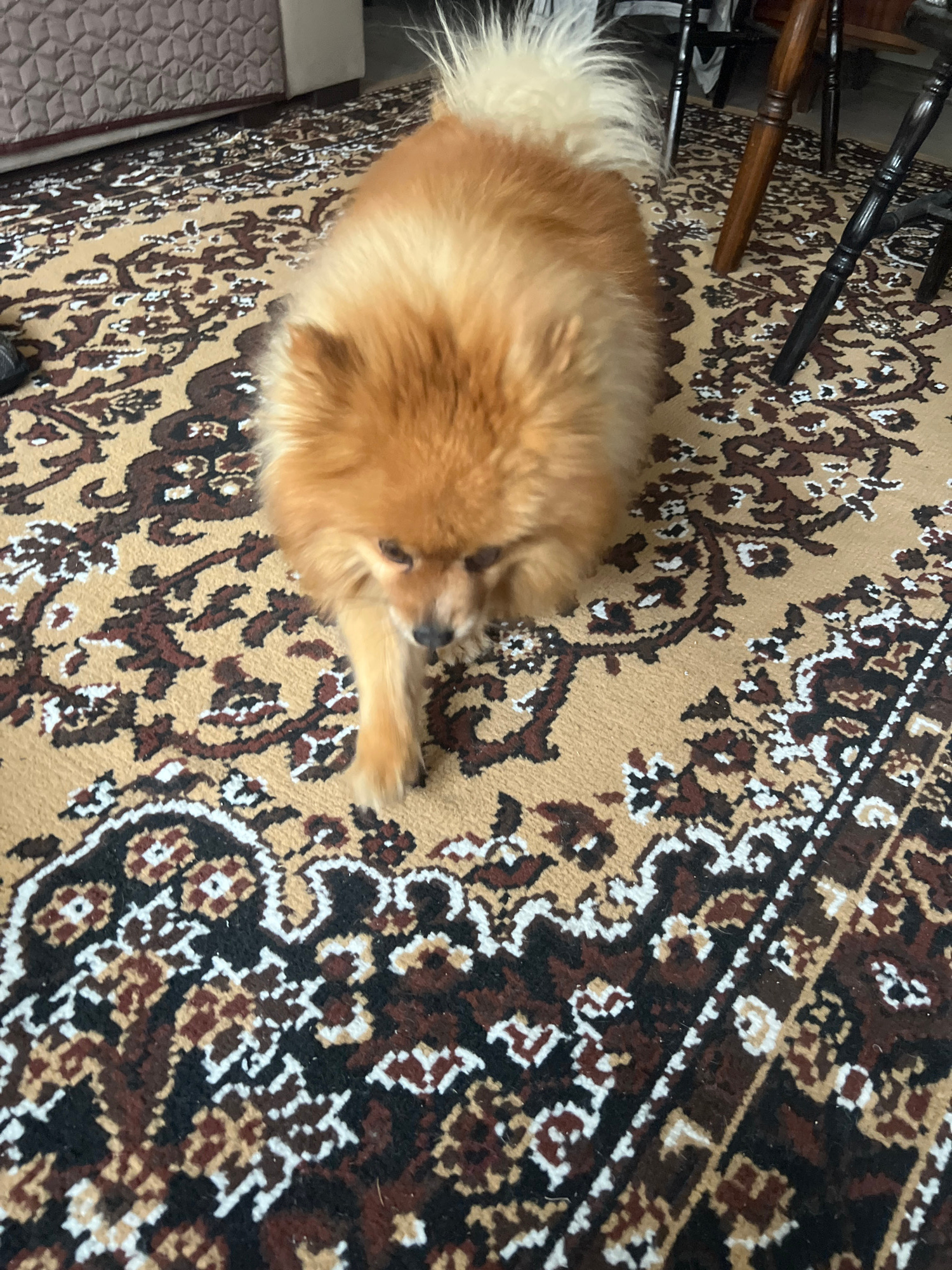 A fluffy, orange Pomeranian dog is lying on a carpet with a complex, patterned design featuring shades of tan, brown, black, and white. The carpet covers the floor, and chair legs are visible in the u…read more