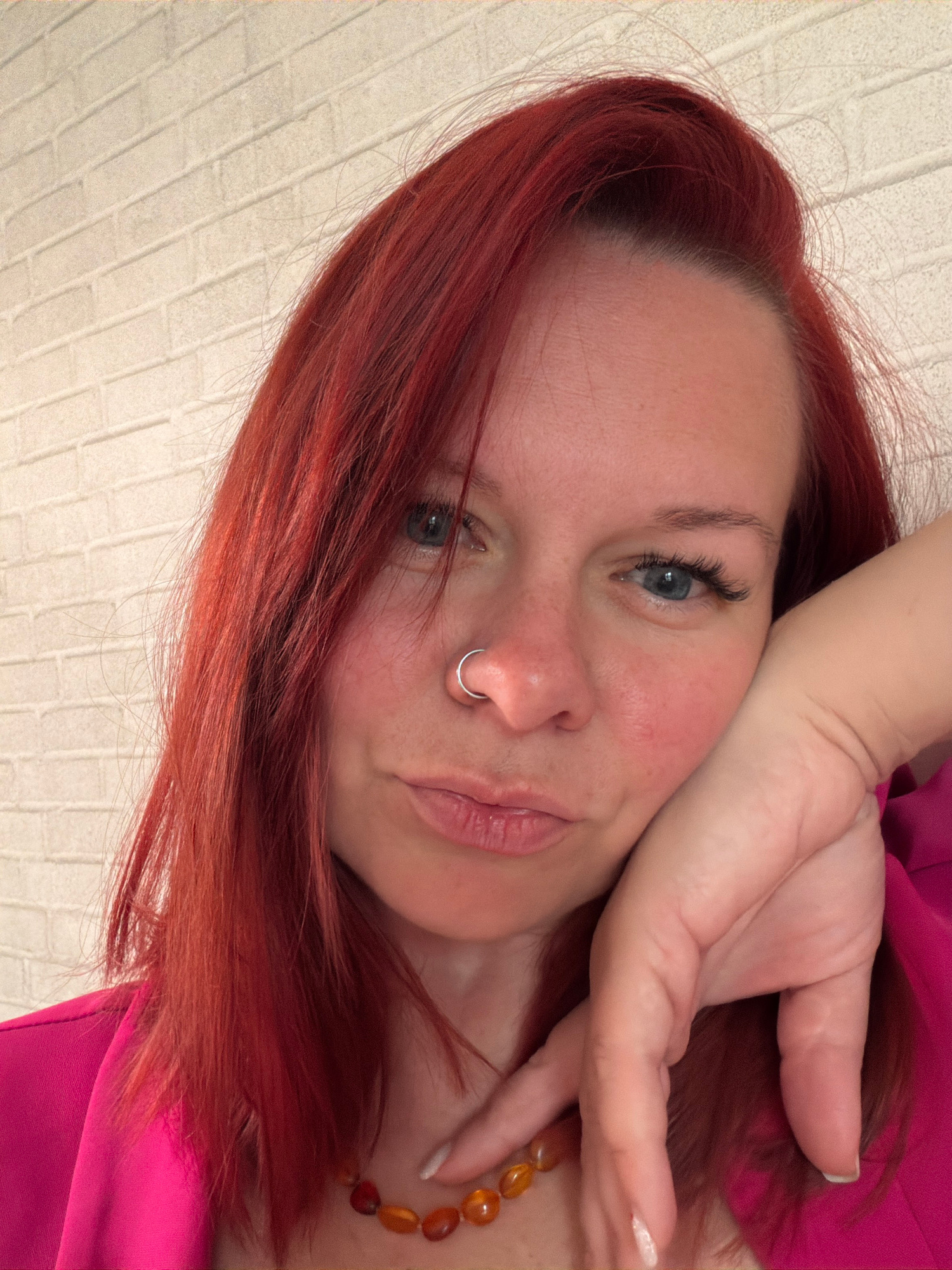 A close-up, selfie-style shot features a fair-skinned woman with red hair. She has blue eyes and a silver nose ring in her left nostril. Her right hand is partially visible, resting near her face. Sheβ¦read more