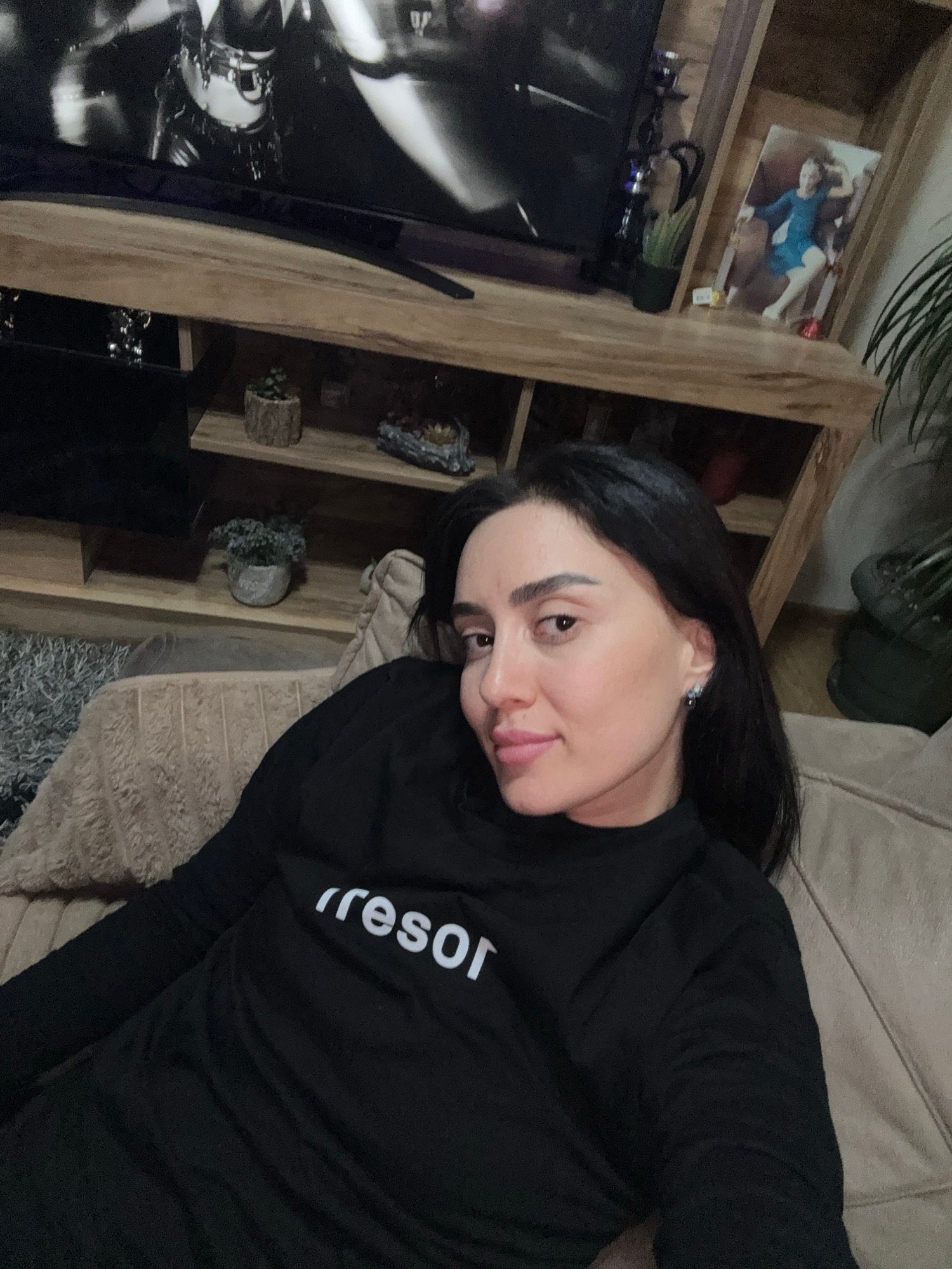 A woman with dark hair is lying on a light-colored, textured couch. She is wearing a black long-sleeved shirt with the word "resor" printed on it. To the left of the couch, there is a tall wooden shel…read more