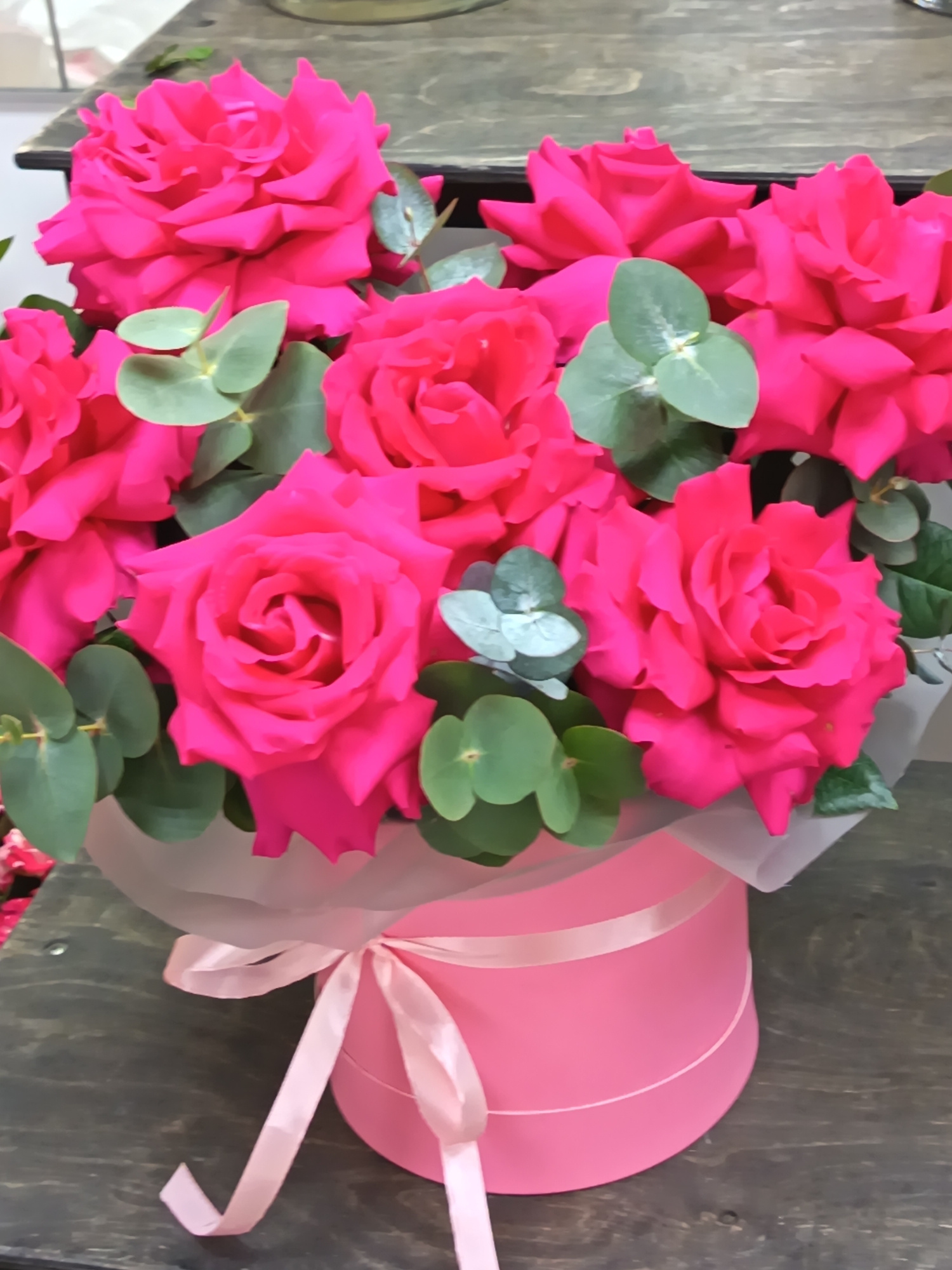 A close-up shot shows a vibrant bouquet of bright pink roses arranged in a round, pink hatbox adorned with a light pink ribbon. The bouquet features the roses interspersed with green eucalyptus leaves…read more