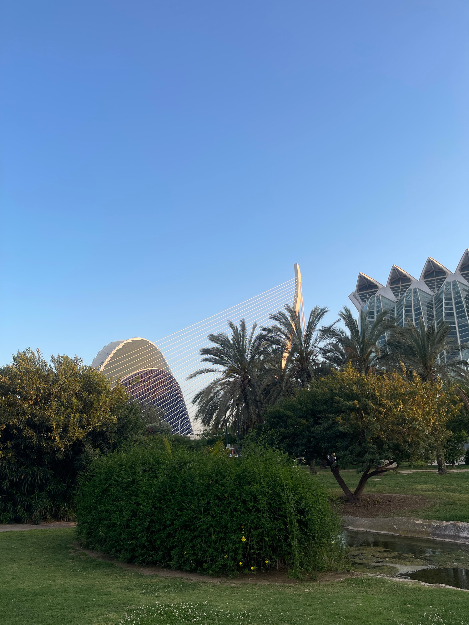 The image captures a scene in Valencia, Spain, featuring elements of the City of Arts and Sciences. The prominent architectural structures include the Museu de les Ciències Príncipe Felipe (the buildi…read more