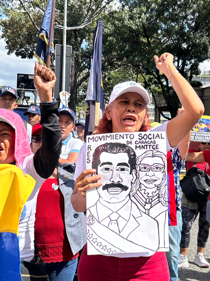 A woman at a rally holds a sign with drawings of two people. The sign reads "Movimiento Social de Caracas MNTTCE". The woman is wearing a white hat and red shirt, and is raising her fist in the air. O…read more