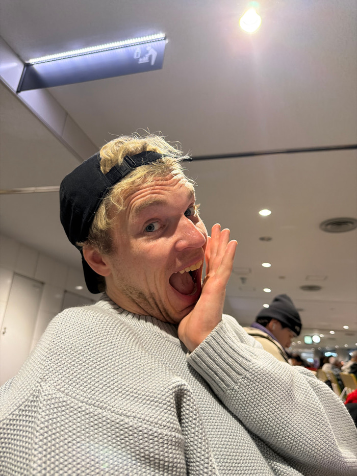 An indoor, eye-level photograph captures a Caucasian male with blonde hair, wearing a black baseball cap backward and a light grey knitted sweater, positioned centrally in the foreground. His face dis…read more