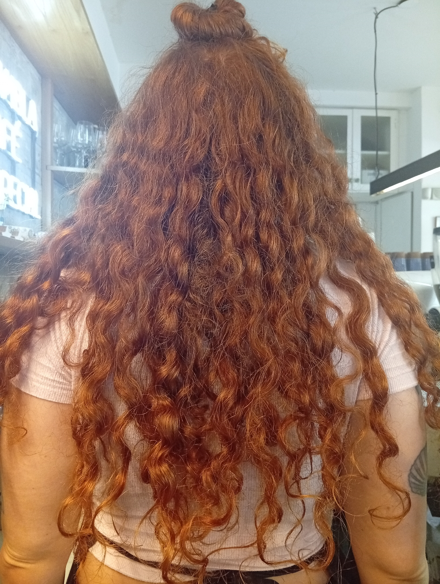 A woman is seen from the back, her long, curly, auburn hair pulled into a high bun. She is wearing a light pink, short-sleeved shirt, and the top of her black bottoms is visible. She has a tattoo on h…read more