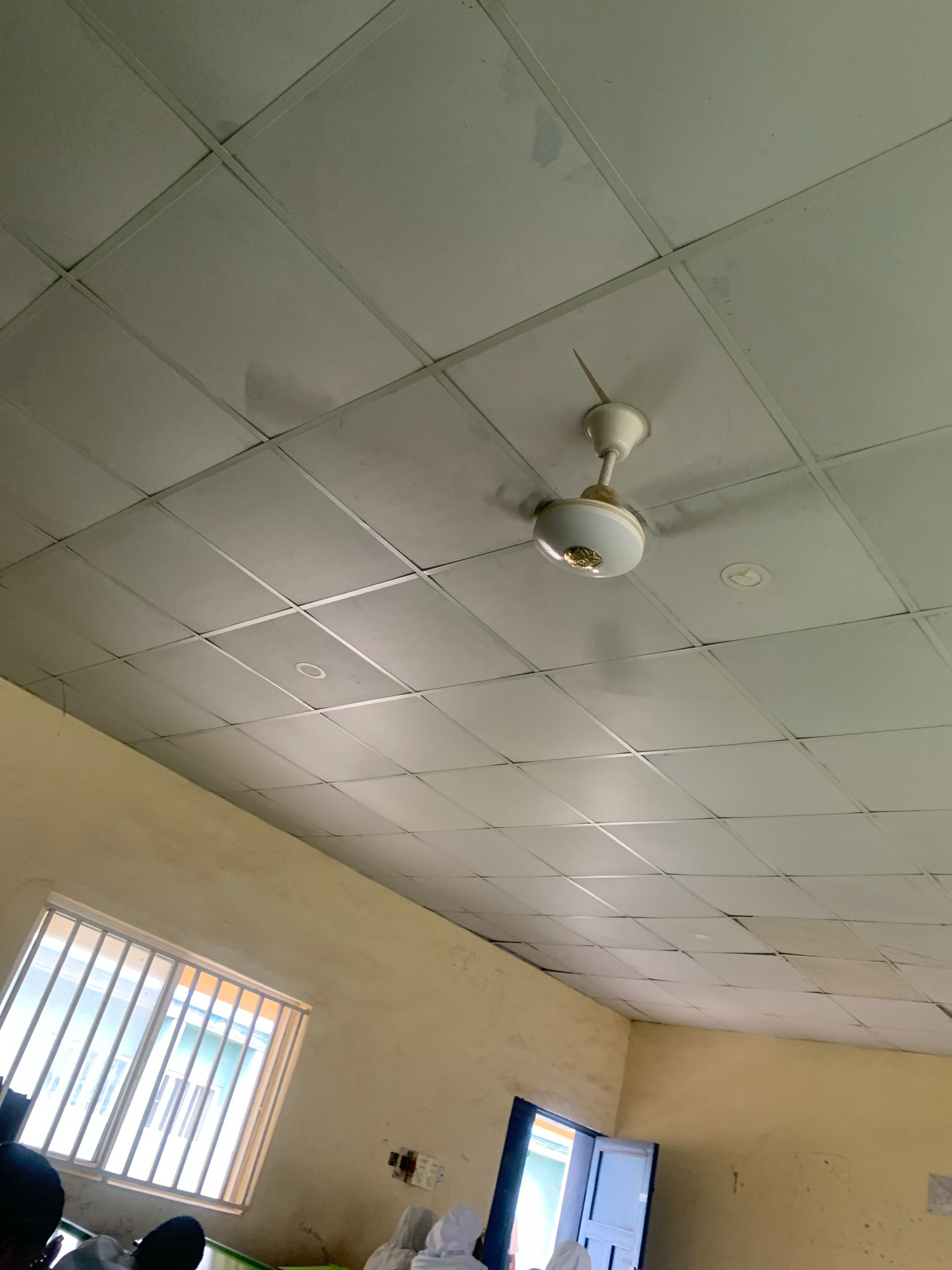 The image shows a ceiling made of square tiles with a three-blade ceiling fan in the middle. The walls are painted a light beige color. There is a window with horizontal blinds, and a TV screen can be…read more