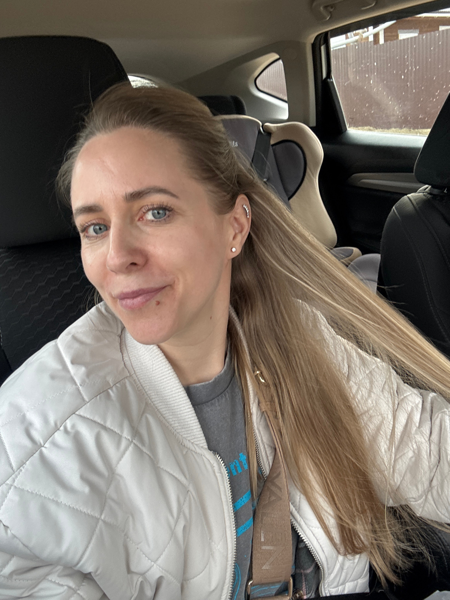 The image features a woman posing for a photo inside a car, situated in what is identified as Chaikovsky, Russia. She is positioned in the front passenger seat, looking directly at the camera with a g…read more