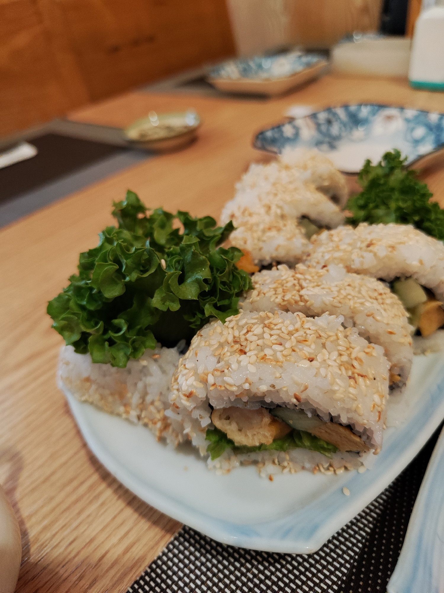 The image shows a plate of sushi rolls sprinkled with sesame seeds, garnished with lettuce, on a table covered with a black and white checkered placemat. The table has a light wooden surface. In the b…read more