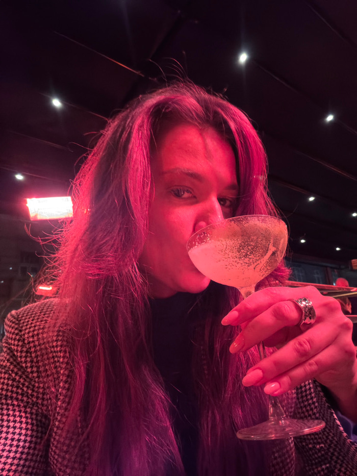The image captures a close-up, angled portrait of a person, likely female, drinking from a stemmed glass in a dimly lit, atmospheric setting. The photograph is rotated 90 degrees clockwise, giving the…read more