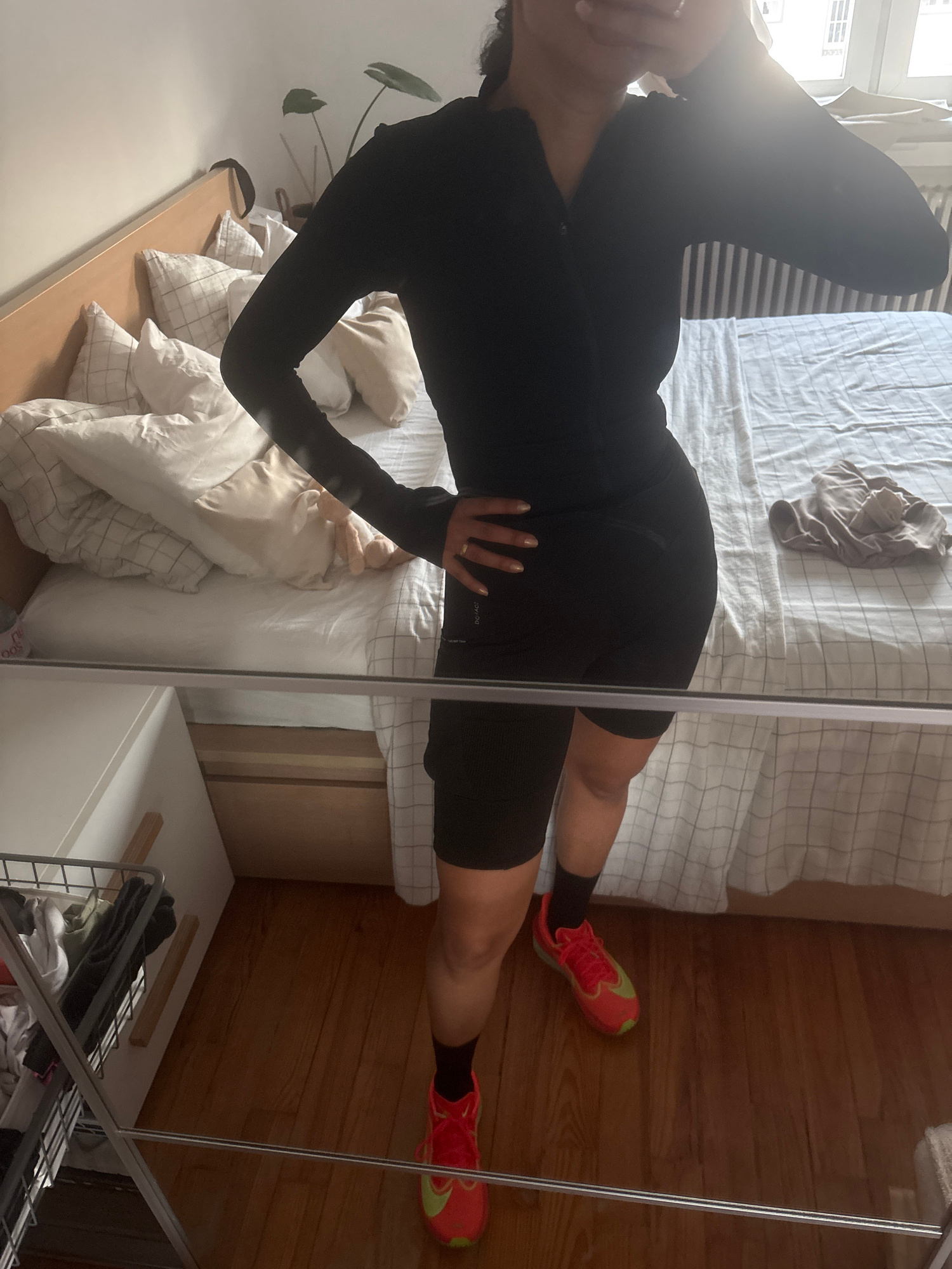 The image depicts an indoor scene, likely a bedroom, viewed from a slightly elevated angle. The primary subject is a person, appearing female, lying on their back on a bed, with their head to the left…read more