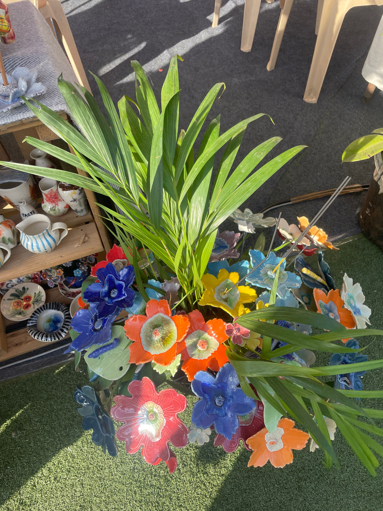 The image captures a vibrant display of ceramic flowers arranged with leafy greenery, likely at an outdoor market or craft fair in Mumbai, India. The arrangement is in a wooden crate alongside ceramic…read more