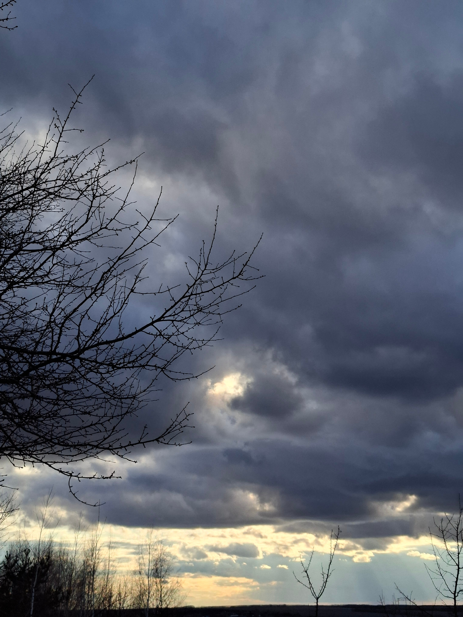 The image shows a view of the sky from Khlevnoye, Russia. The sky is filled with dark, heavy clouds, with a small patch of light visible between them. The silhouette of a bare tree is visible in the f…read more