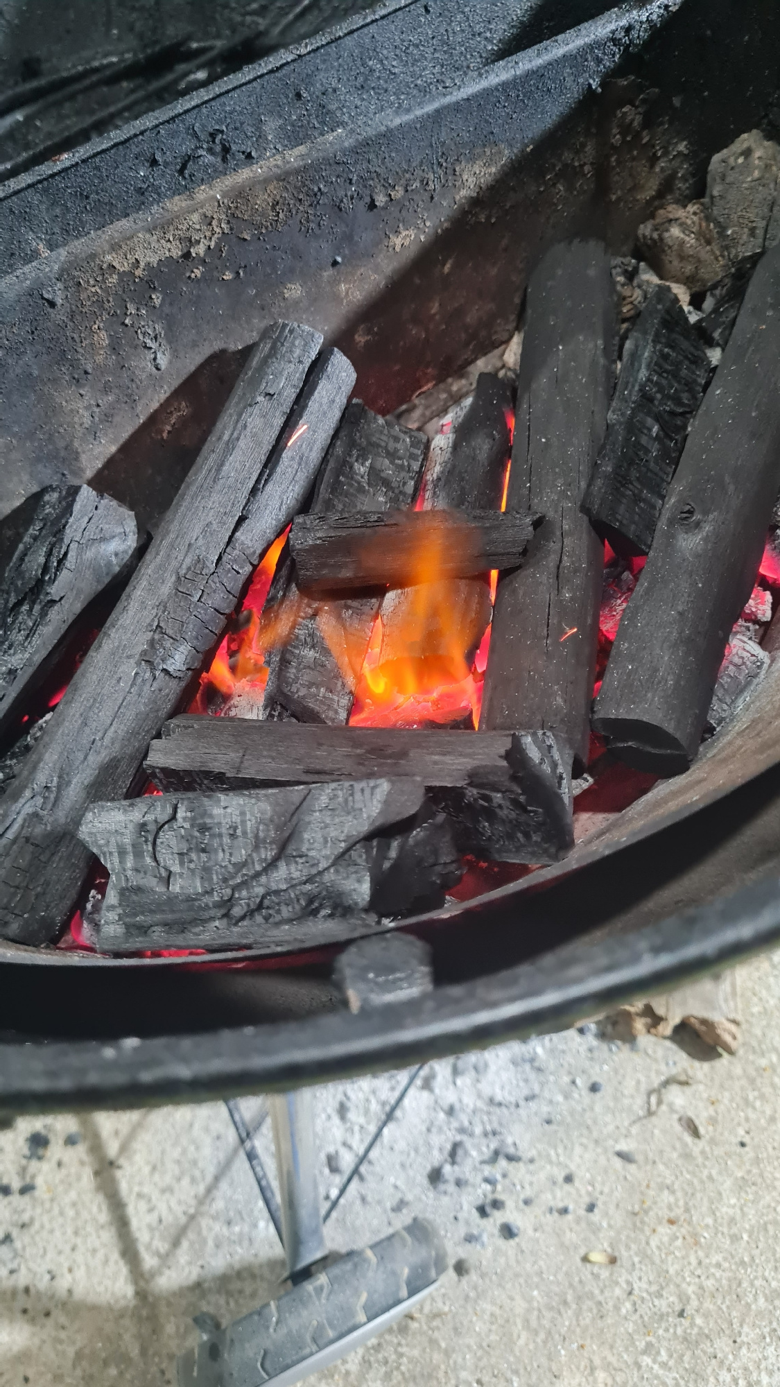 A charcoal grill is seen from an overhead angle. The grill is black and cylindrical, with a layer of charred wood arranged inside, glowing with embers. The presence of wheels on the side suggests theβ¦read more