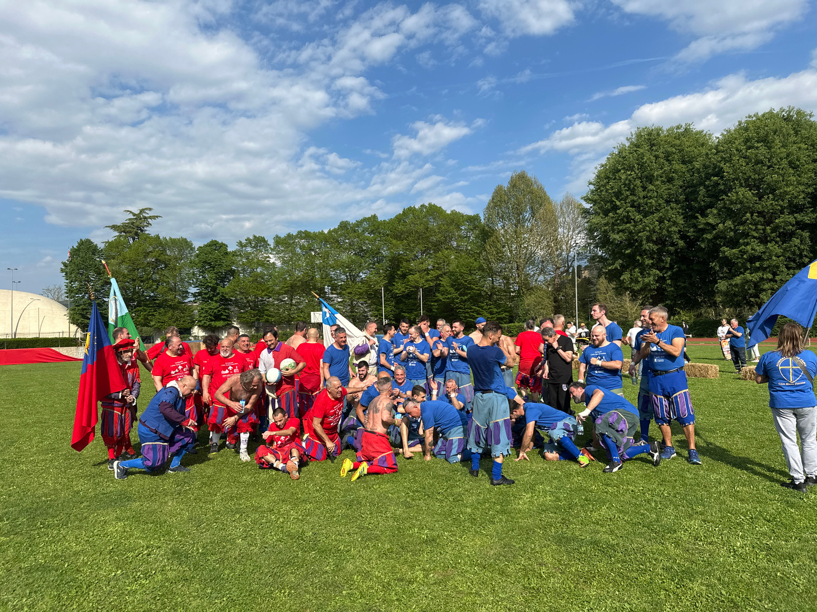 This outdoor image captures a dynamic gathering of people, primarily adult men, on a vibrant green grassy field, likely following a sporting event. The scene unfolds under a bright, partly cloudy sky,…read more