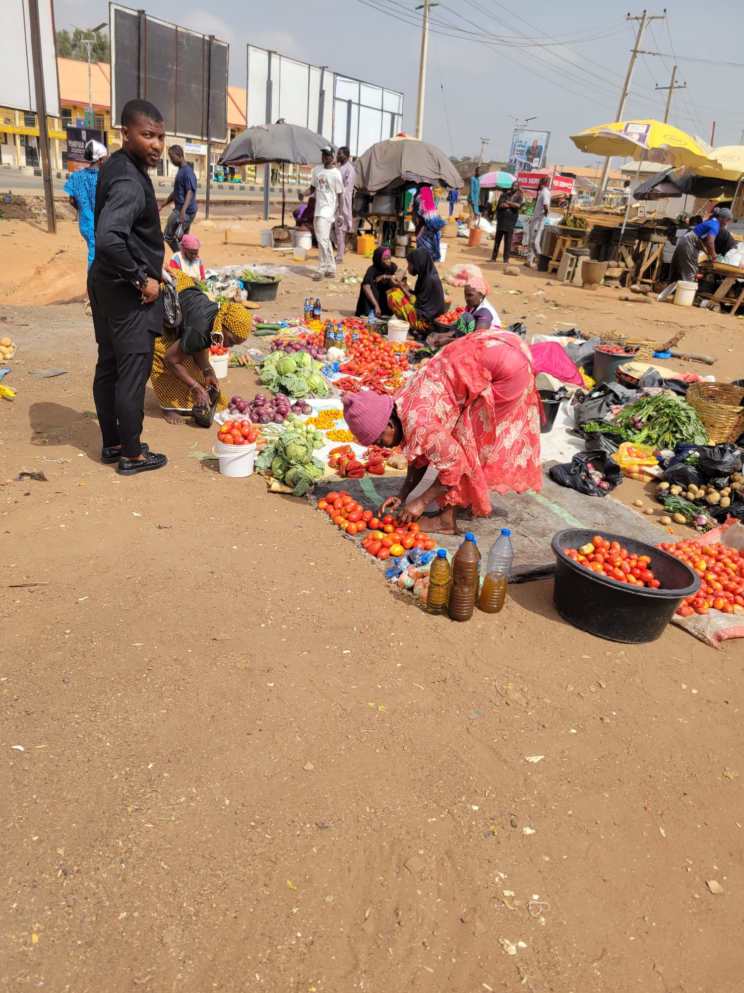 The image depicts a bustling market scene in Jos, Nigeria. The ground is a reddish-brown dirt surface. Several vendors, predominantly women, are selling produce laid out on the ground. The items for s…read more