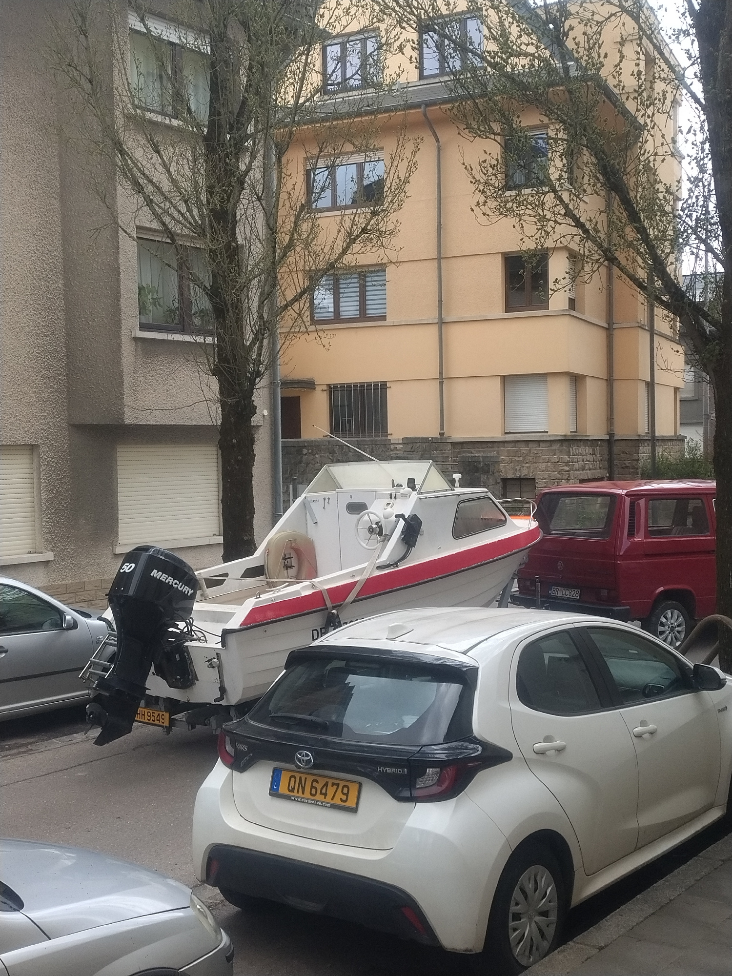 The image shows a street scene in Luxembourg City, Luxembourg, featuring several parked vehicles, a boat on a trailer, and buildings. A white Toyota Yaris Hybrid with license plate "QN 6479" is parkedβ¦read more
