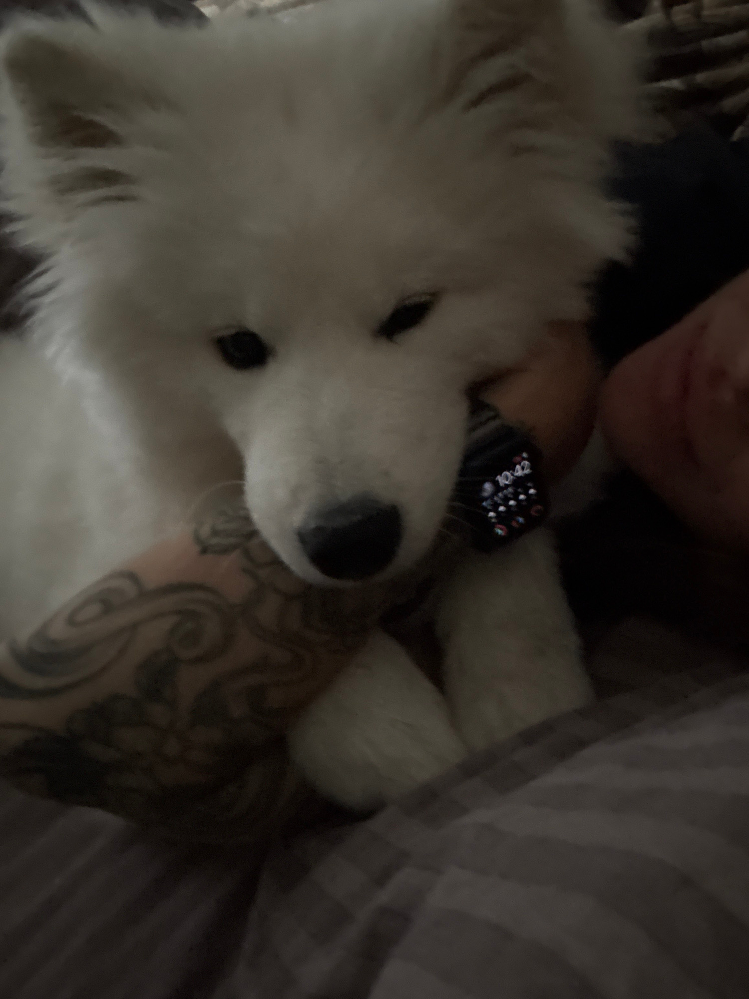 A white Samoyed dog lies next to a person. The person's arm is visible, featuring a tattoo that extends from the wrist towards the upper arm. A smartwatch is visible on the person's wrist near the dog…read more