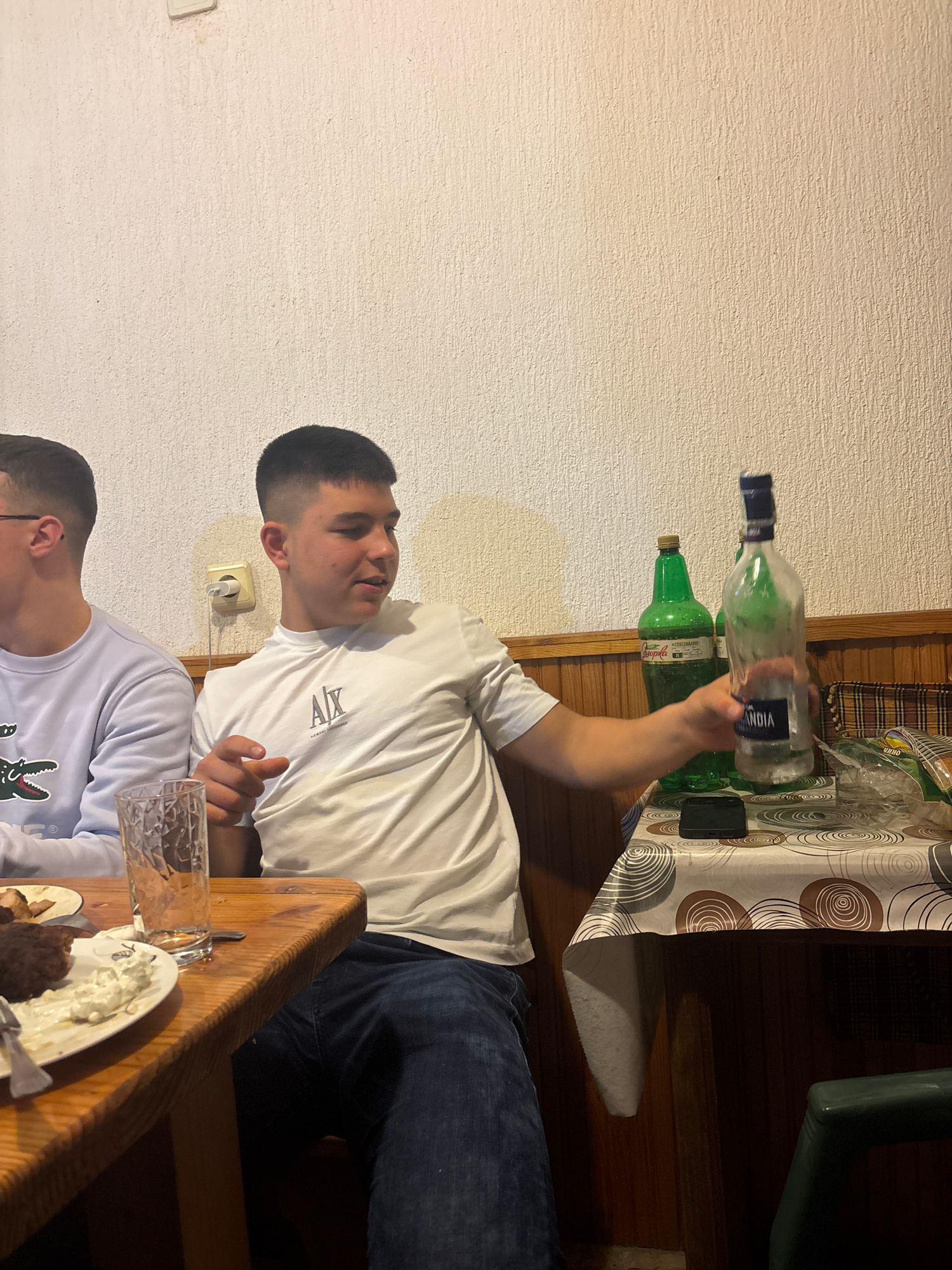 The image shows two men at a table. One man is holding a bottle of vodka. There are also bottles of "Mastika" at the table. The location is likely a home in Zlatograd, Bulgaria. Food and drinks are pr…read more