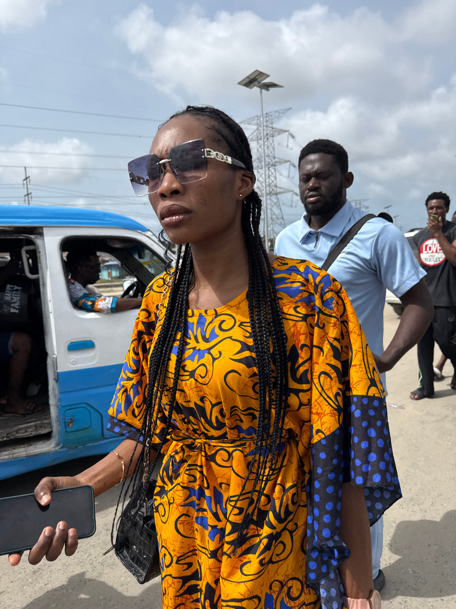 A woman with braided hair, wearing sunglasses and a yellow and blue patterned dress, stands near a blue and white bus, holding a black smartphone in her right hand. Behind her is a man in a light blue…read more