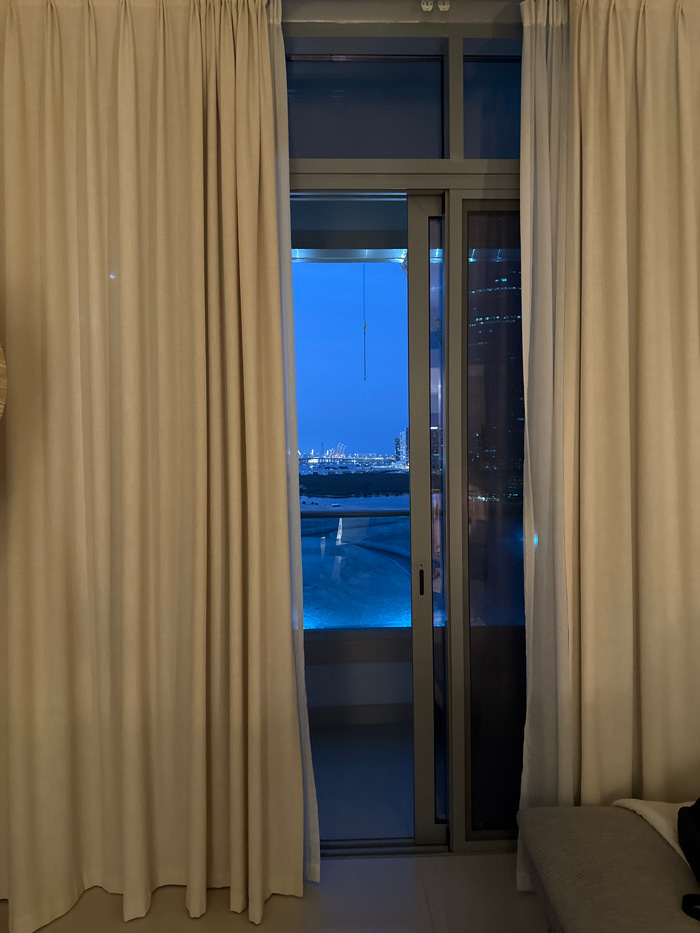 The image captures an interior perspective looking outward through a large, multi-paneled glass door and fixed window at twilight or night in Abu Dhabi, United Arab Emirates. Beige, pleated curtains a…read more