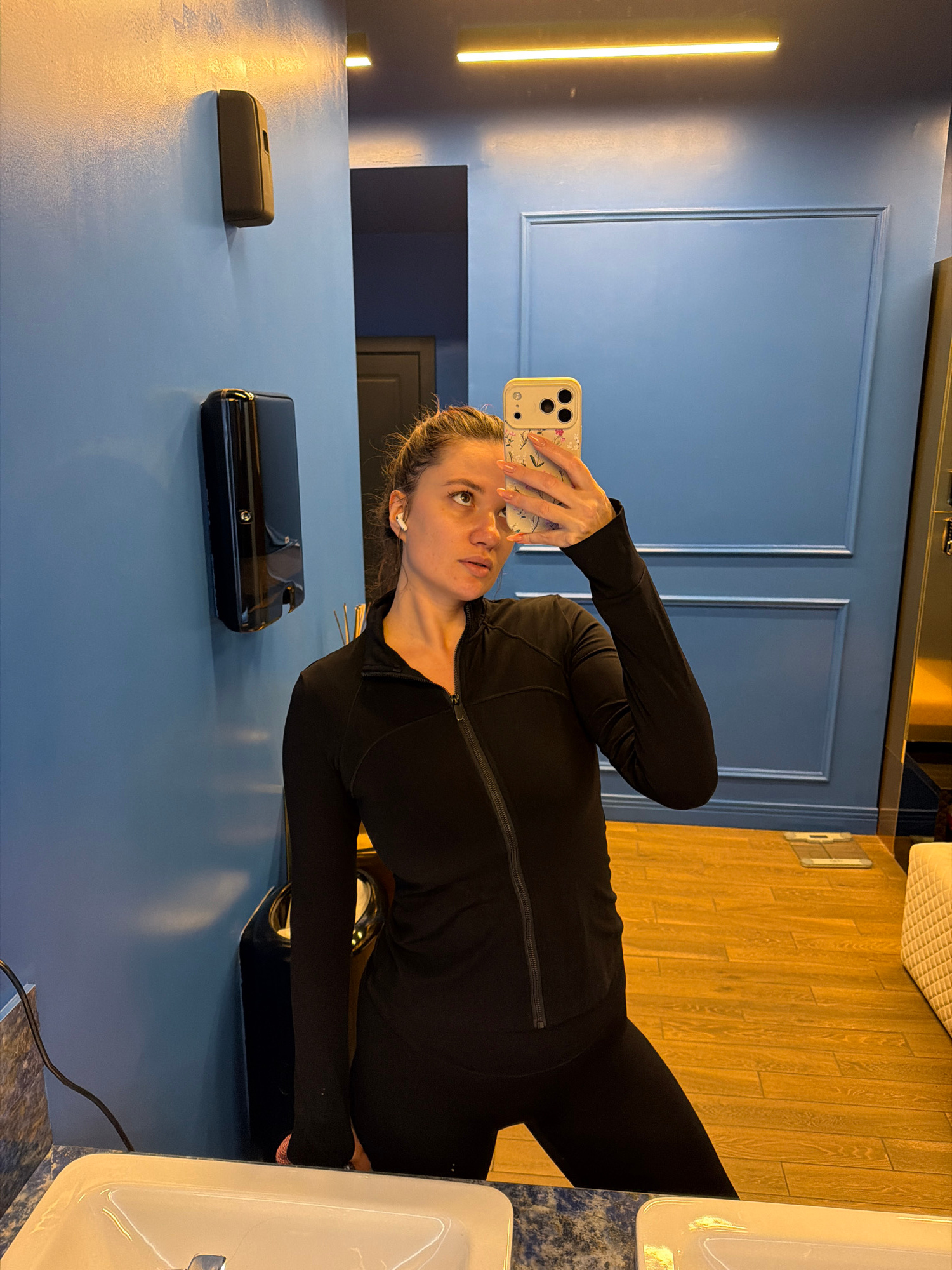 A woman in black leggings and a black zip-up top is taking a selfie with a smartphone in a bathroom. She has blonde hair pulled back, and an AirPod is visible in her ear. The bathroom features a blue…read more