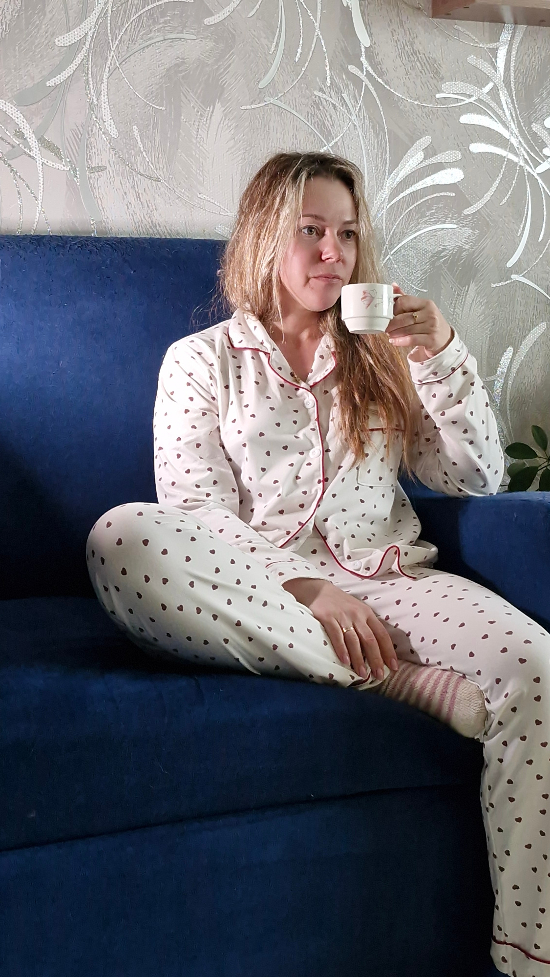 A woman is reclining on a blue sofa, dressed in pajamas patterned with small brown hearts, and striped socks. She is holding a white mug. The background includes a wall with an ornate silver design anβ¦read more