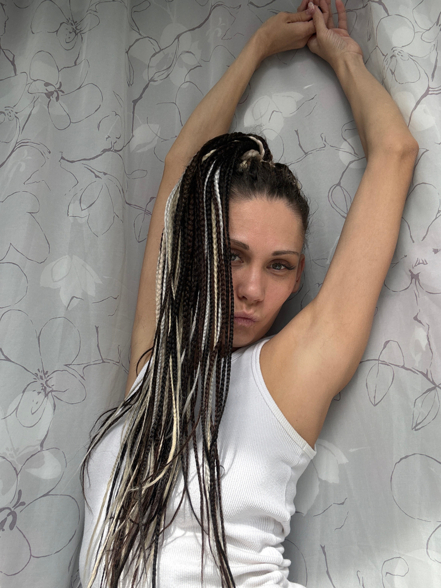 A woman is lying on a bed in Rusanovo, Russia. She is wearing a white tank top and has dark hair styled in braids with blonde highlights. Her arms are stretched above her head. The bed is covered withβ¦read more
