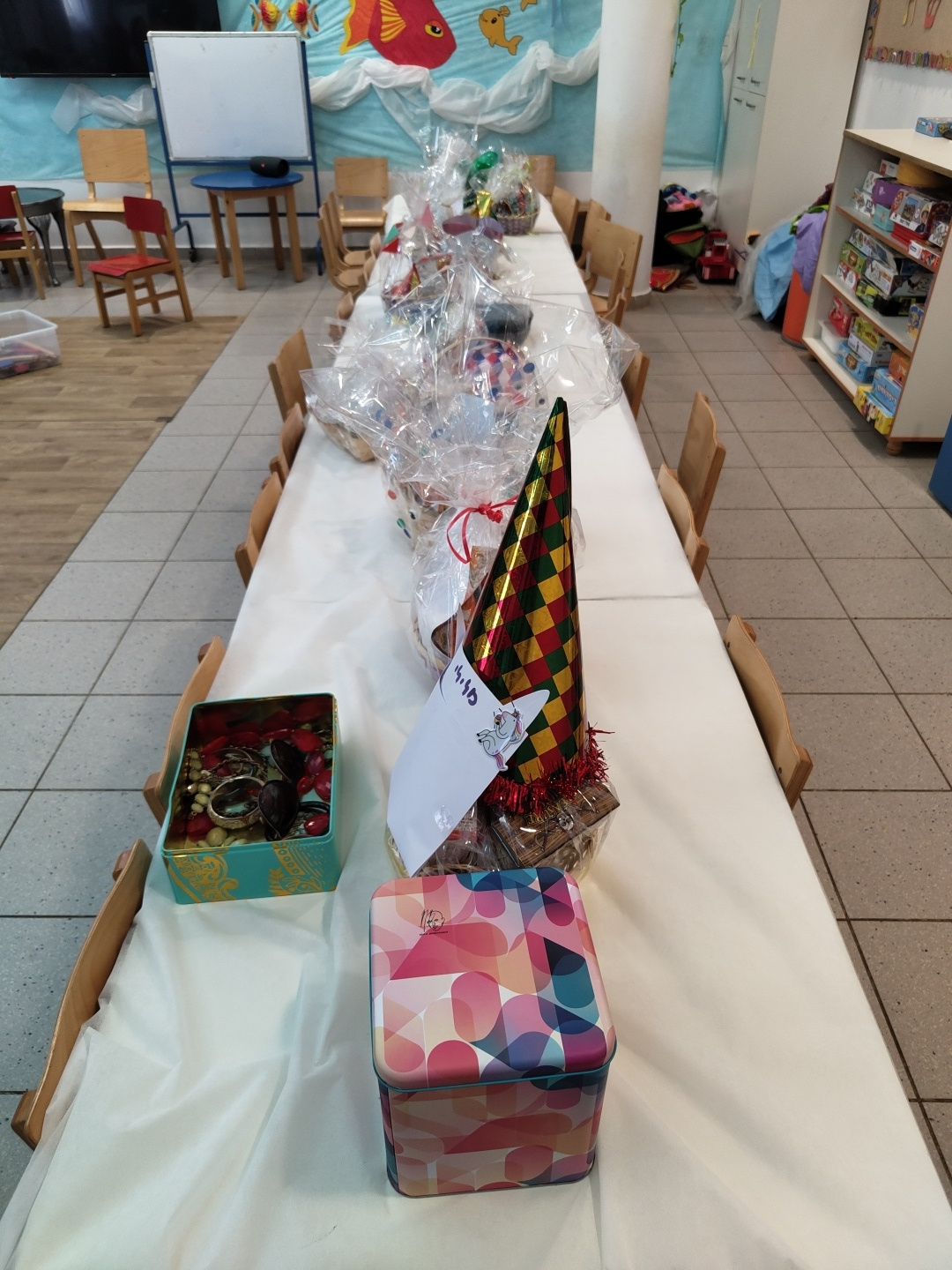 An indoor scene, likely a classroom or community center, is set up for a celebration. A long table, draped in a white tablecloth, stretches across the frame, laden with numerous wrapped gifts and deco…read more