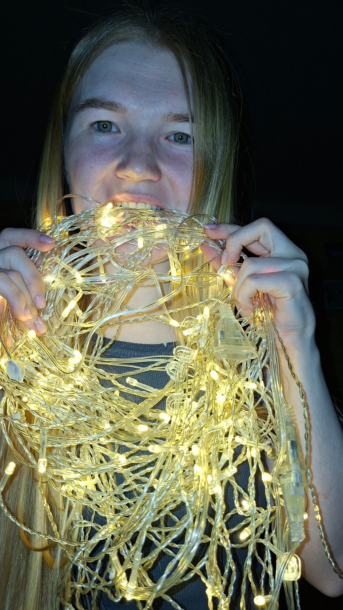 A woman with light skin and blonde hair, lying on her side, is holding a large bundle of glowing, small, warm-toned fairy lights. The lights are intertwined and partially obscure her face, though her…read more