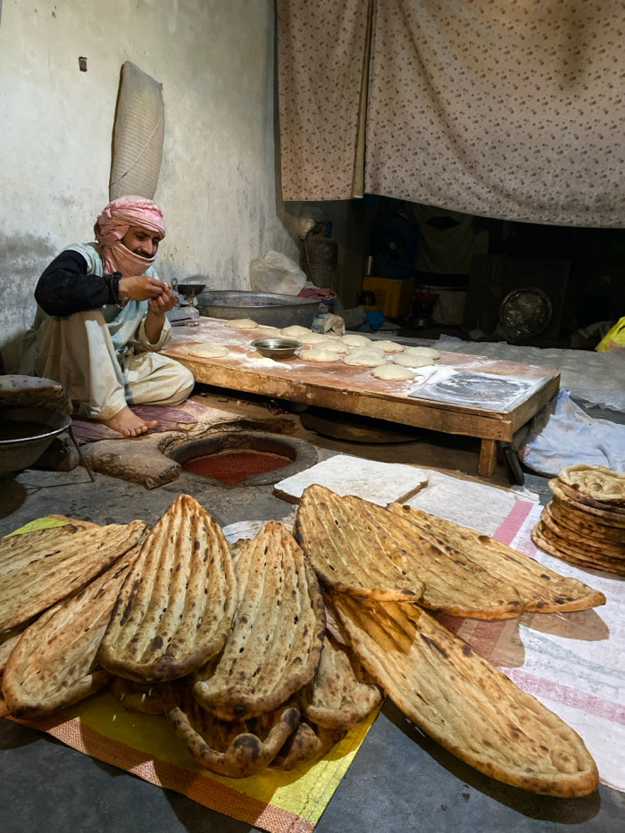 A man, partially obscured by a pink head covering, sits near a tandoor oven, his bare feet visible. To his right, a table laden with dough circles is next to the oven. Freshly baked, elongated flatbre…read more