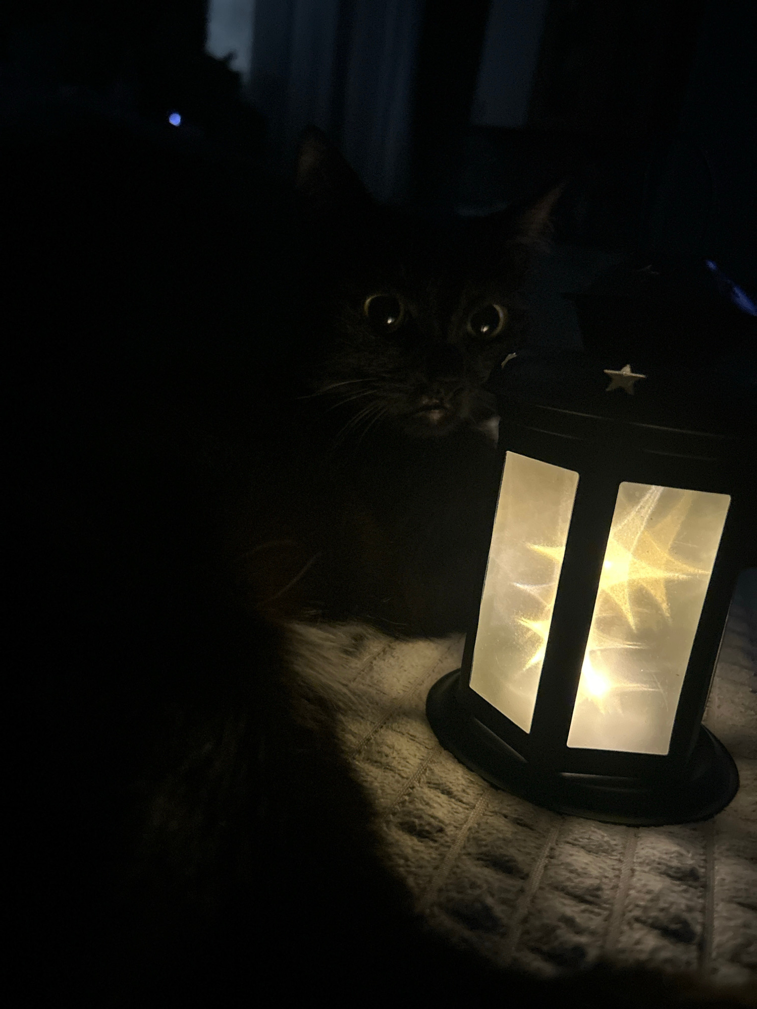 A dark-haired cat is positioned under a black lantern with a star on top. The lantern, which is providing illumination, casts a starburst pattern on its frosted glass. The cat's eyes are visible, refl…read more